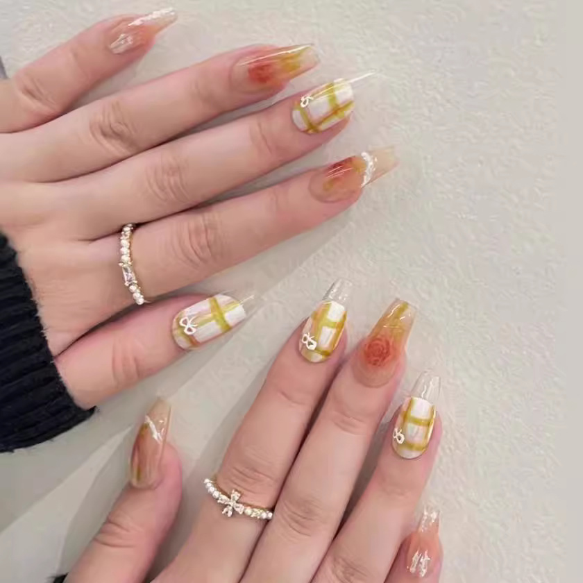 穿戴美甲玫瑰花绿白晕染棋盘格穿戴美甲高级假指甲果冻胶美甲甲片
