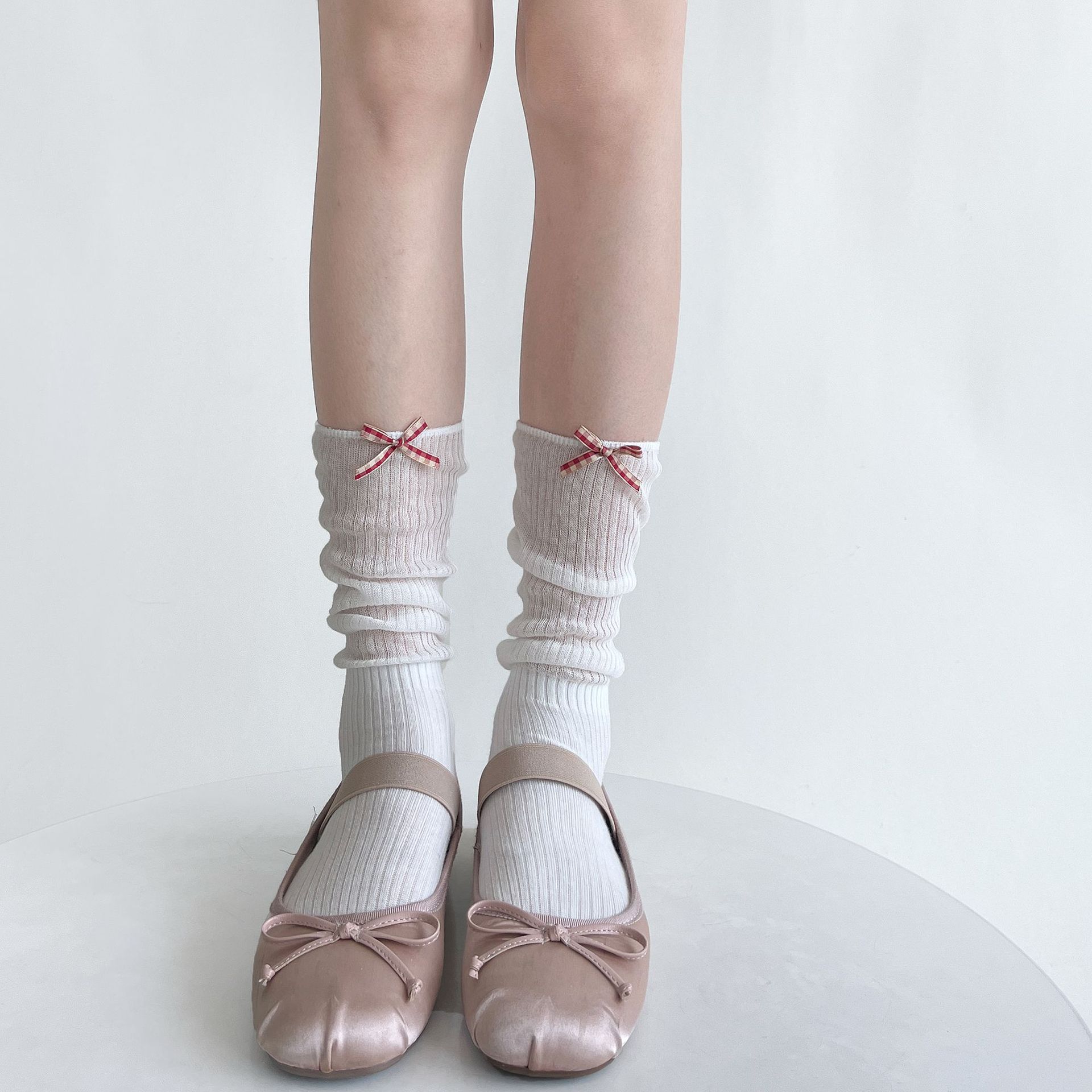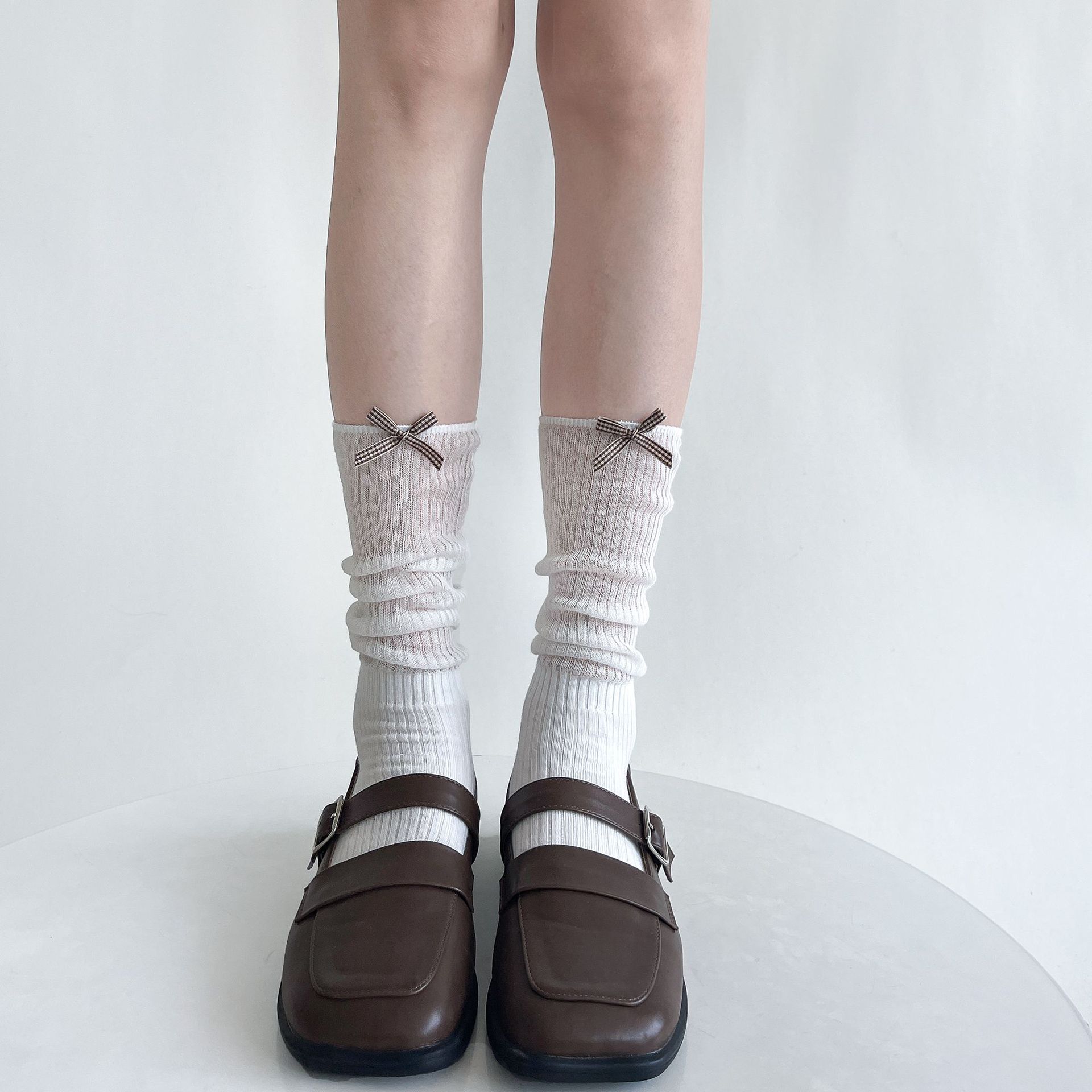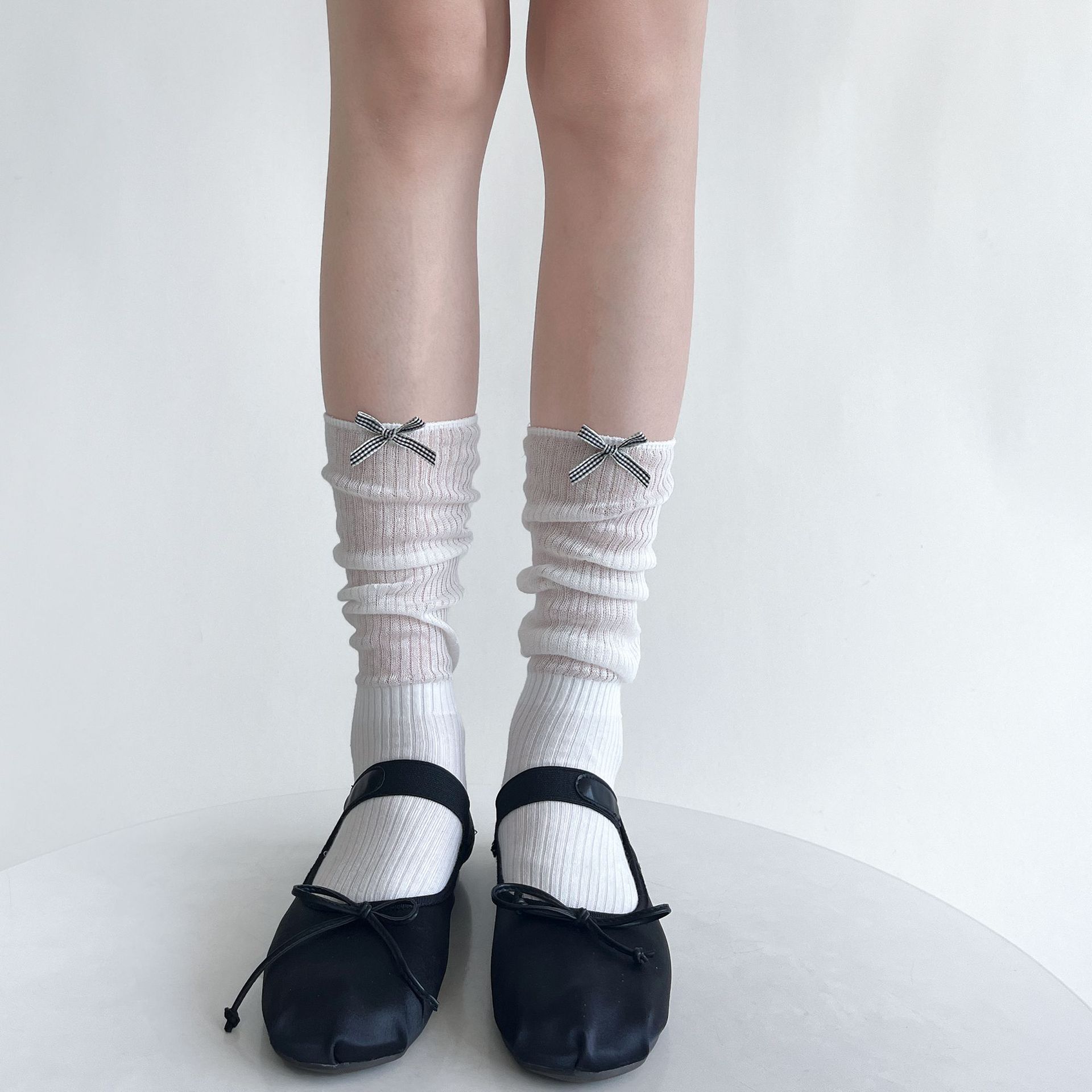 夏季薄透棉纱竖条堆堆显瘦小腿袜女甜美蝴蝶结纯欲中筒袜少女白色
