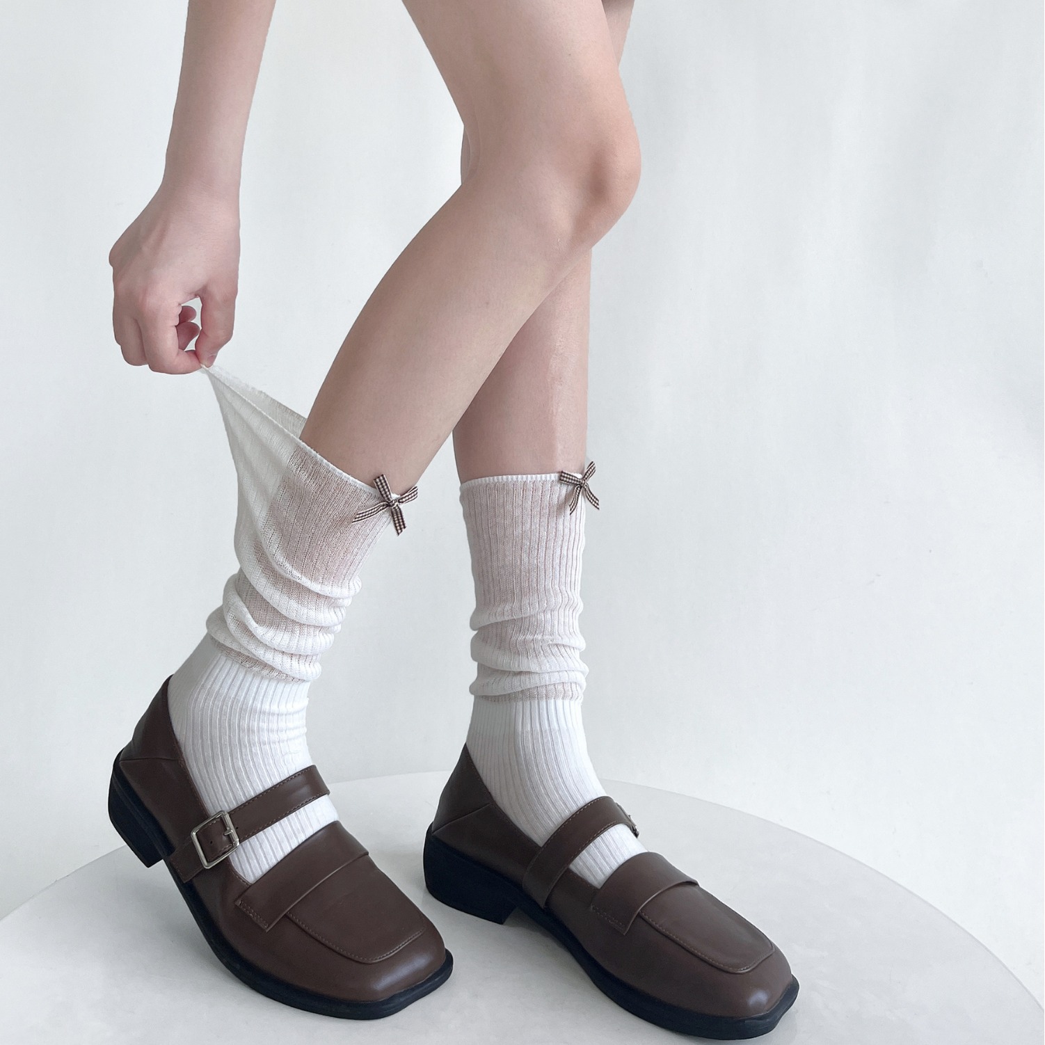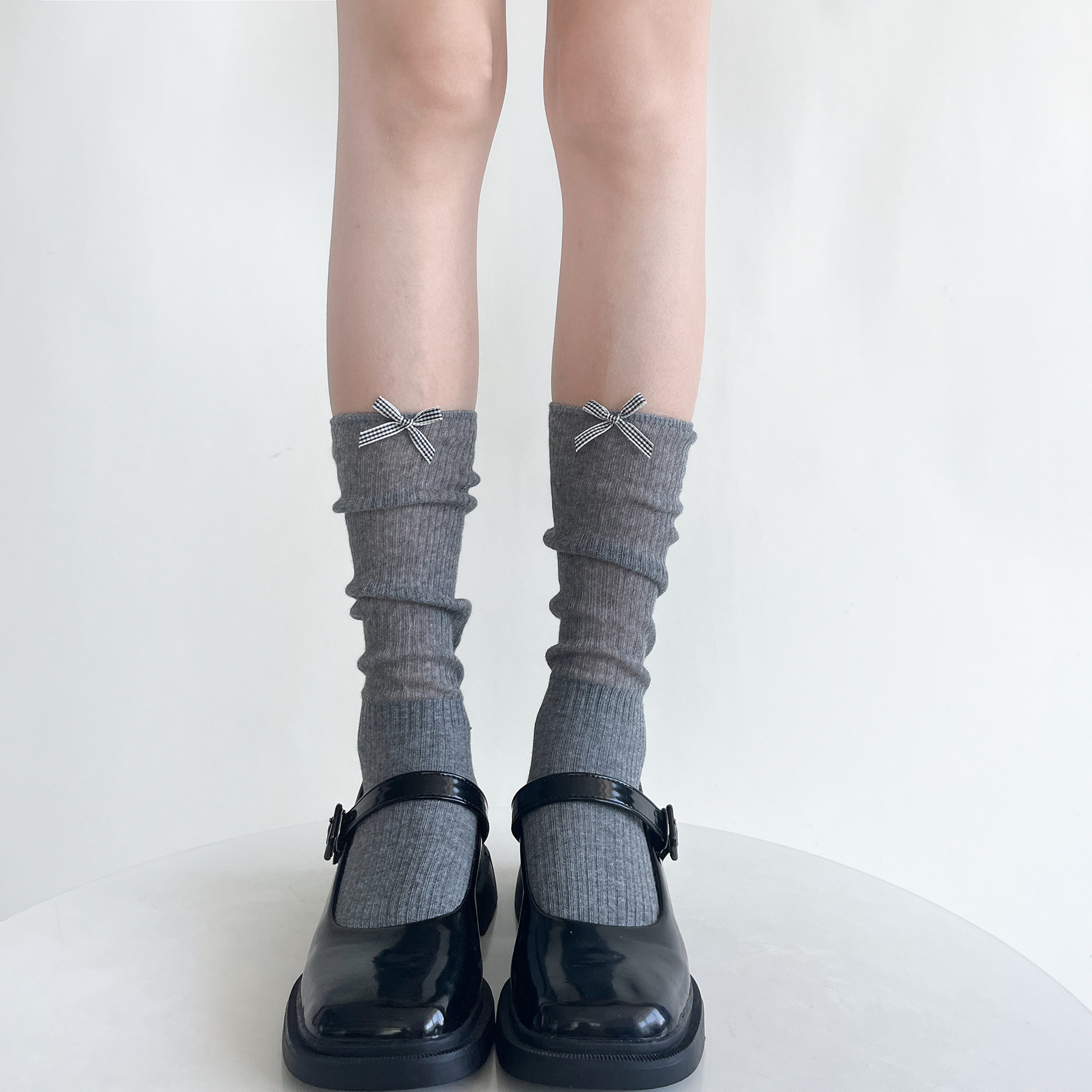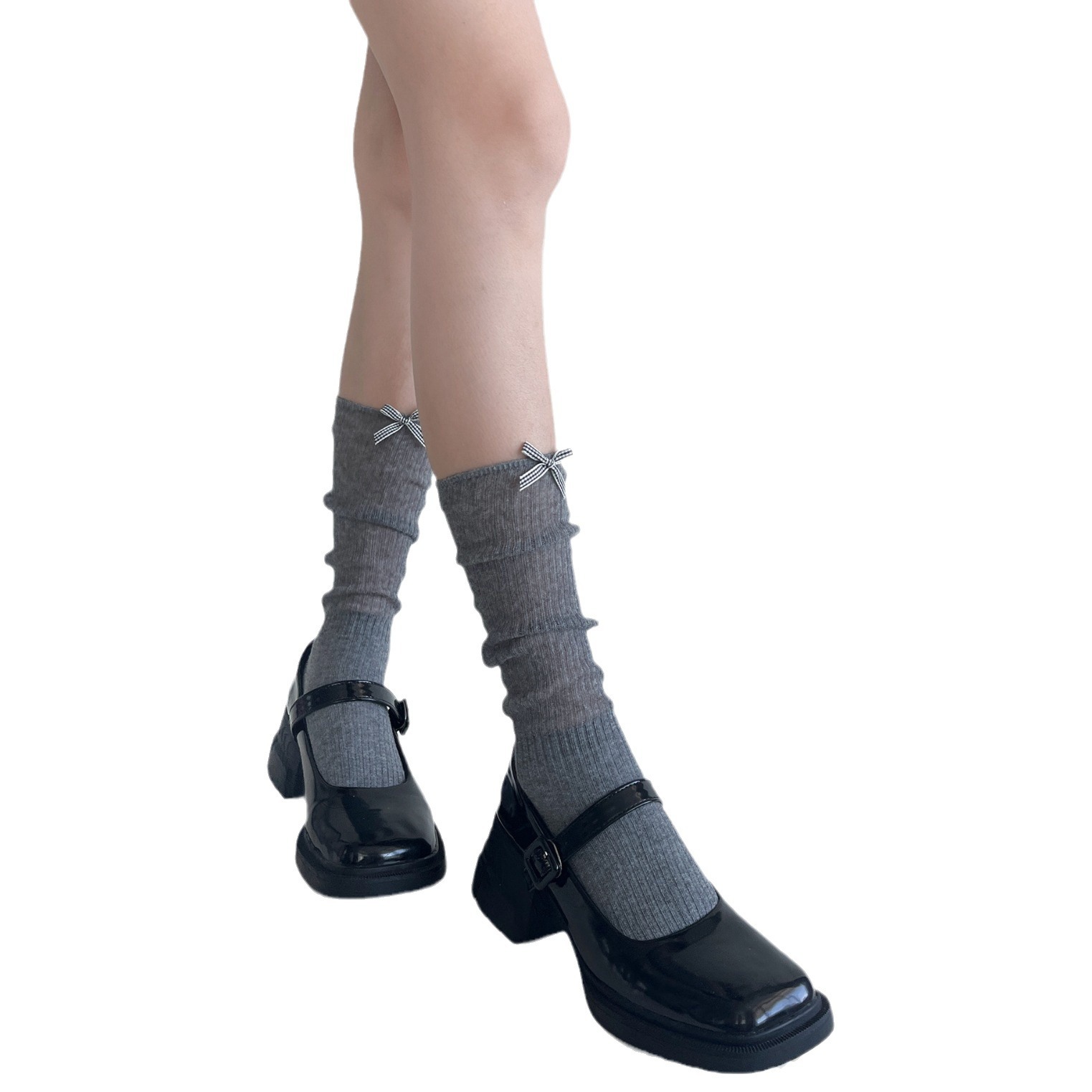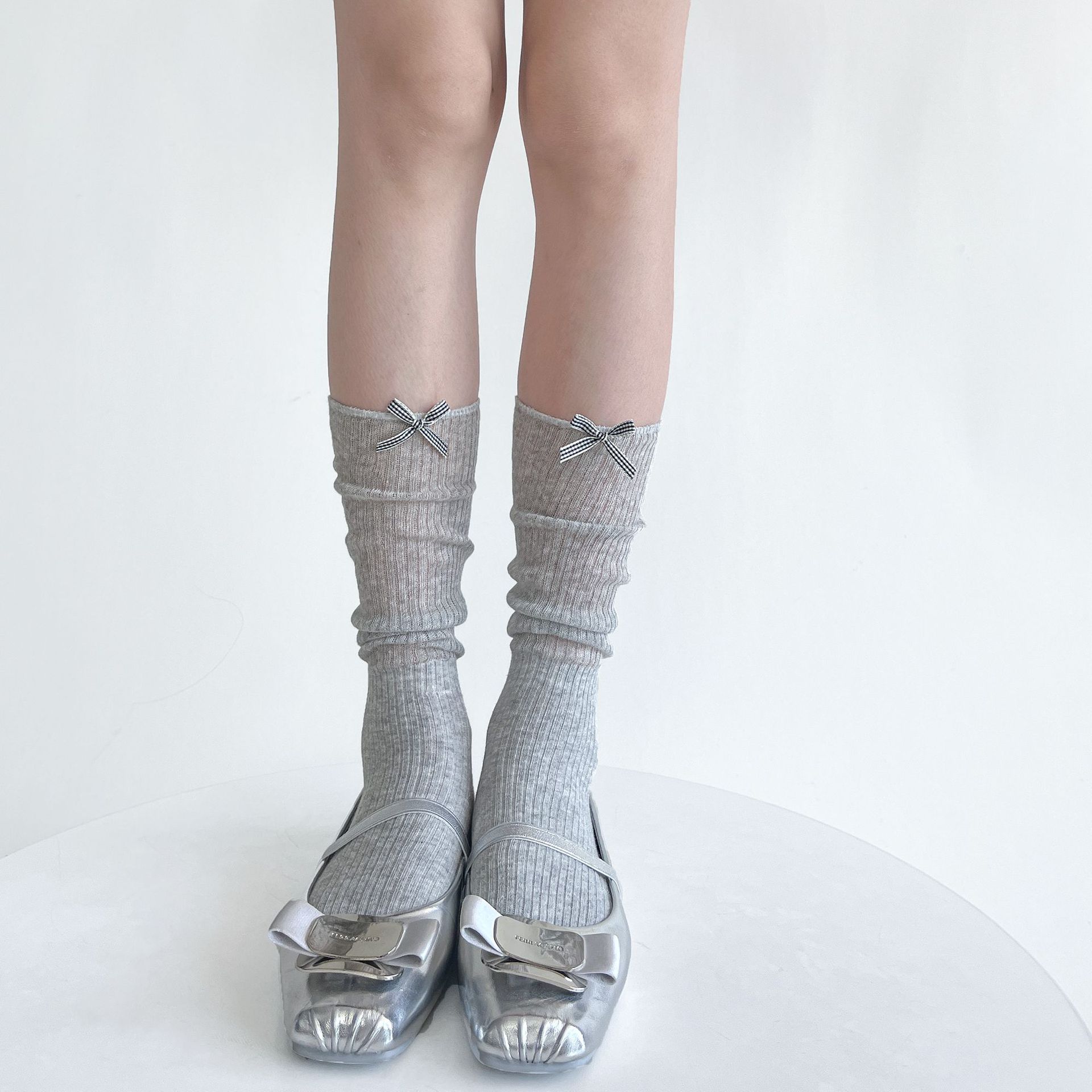 夏季薄透棉纱竖条堆堆显瘦小腿袜女甜美蝴蝶结纯欲中筒袜少女白色