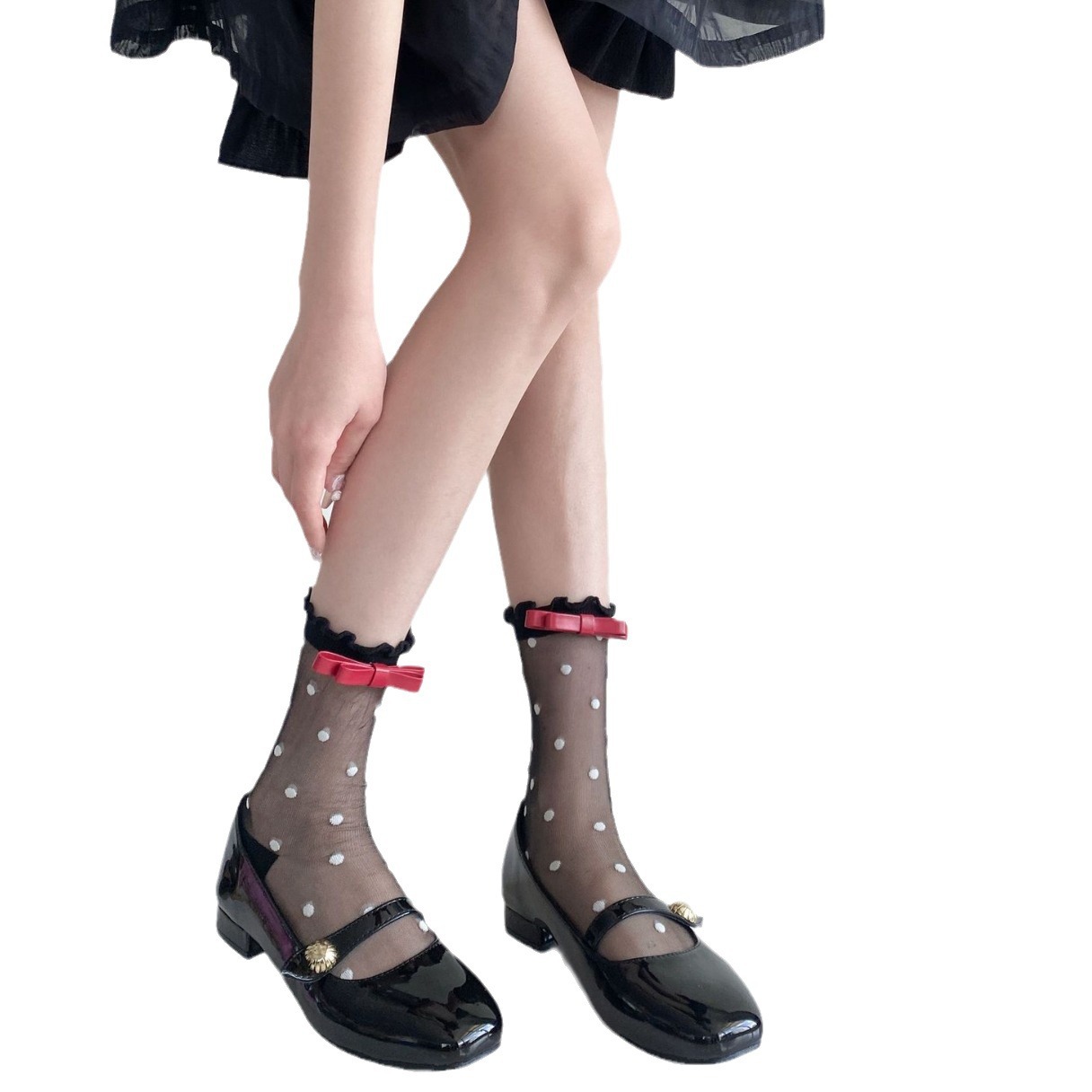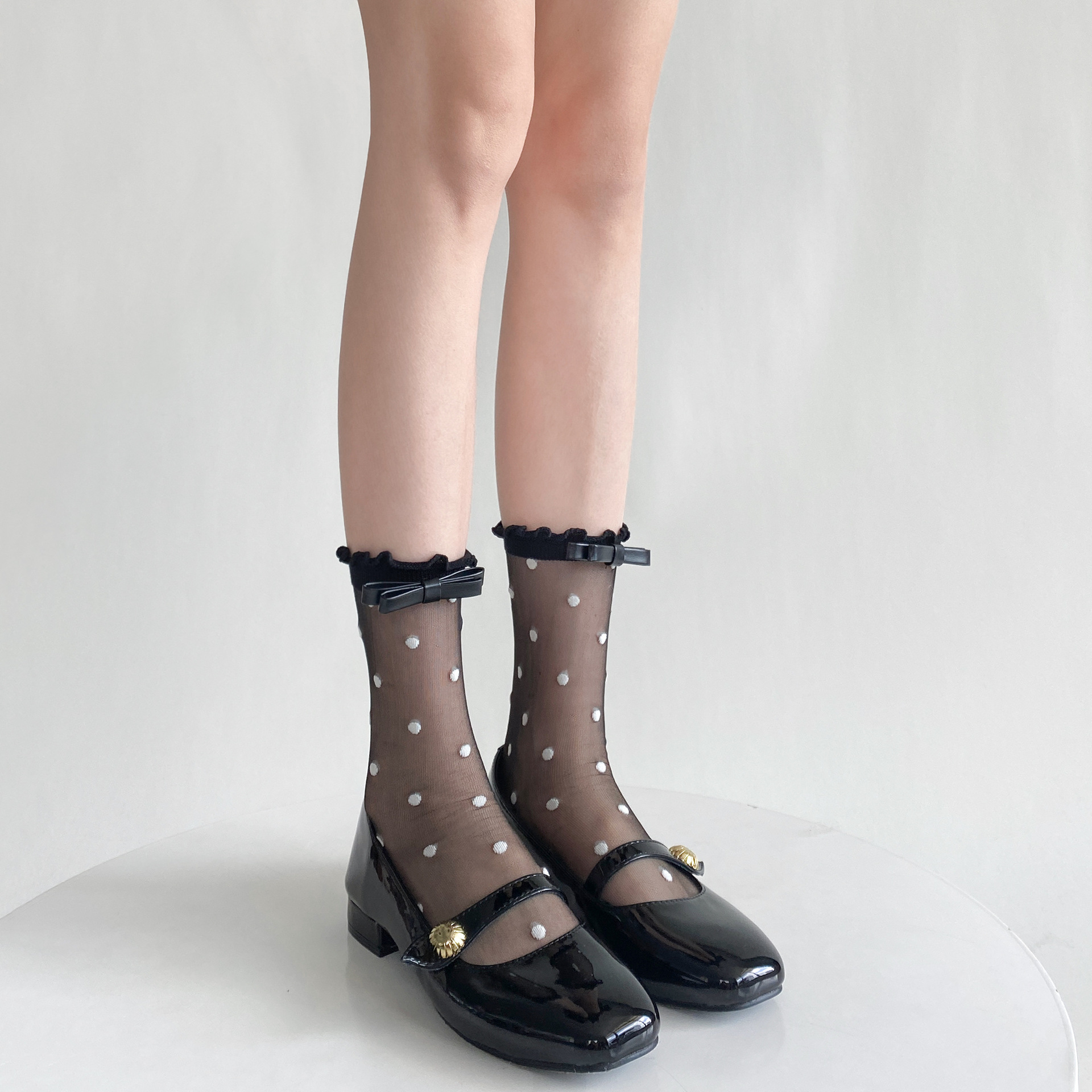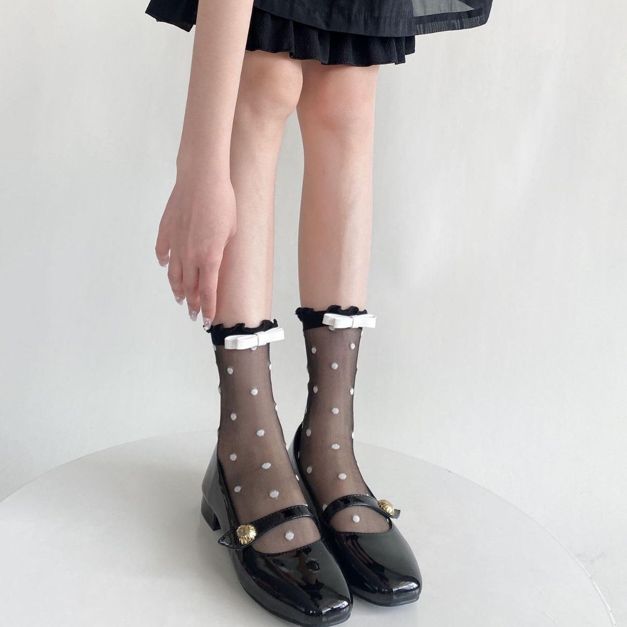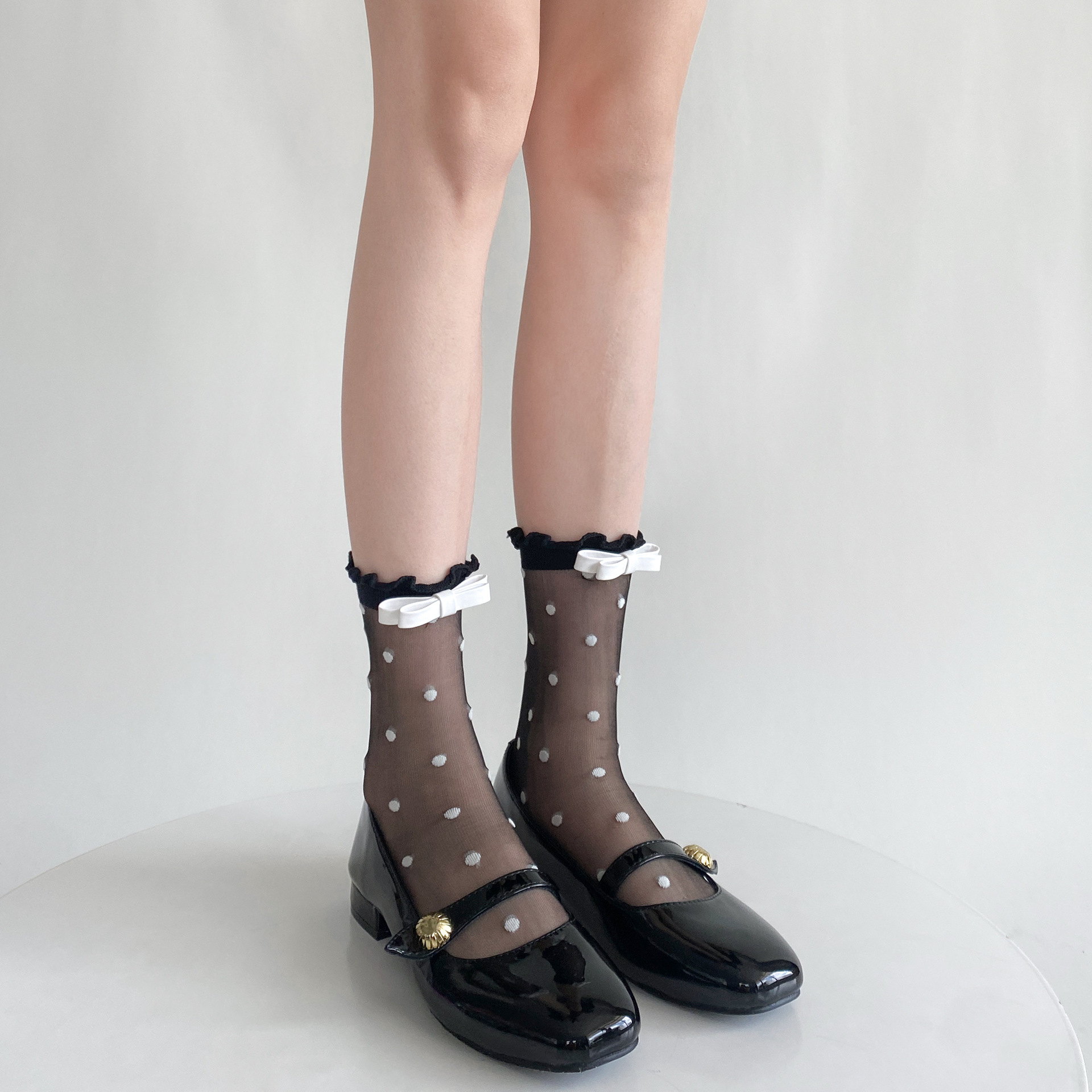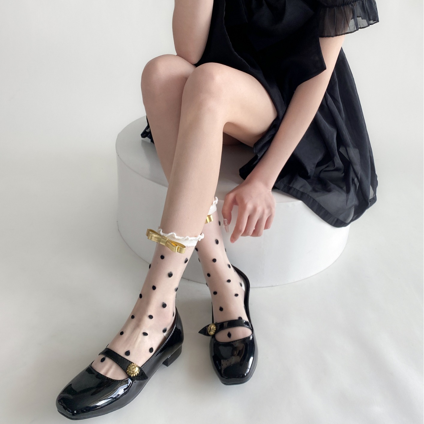 日系jk圆点中筒袜子女春夏季超薄卡丝透肉黑色短丝袜甜美白色波点