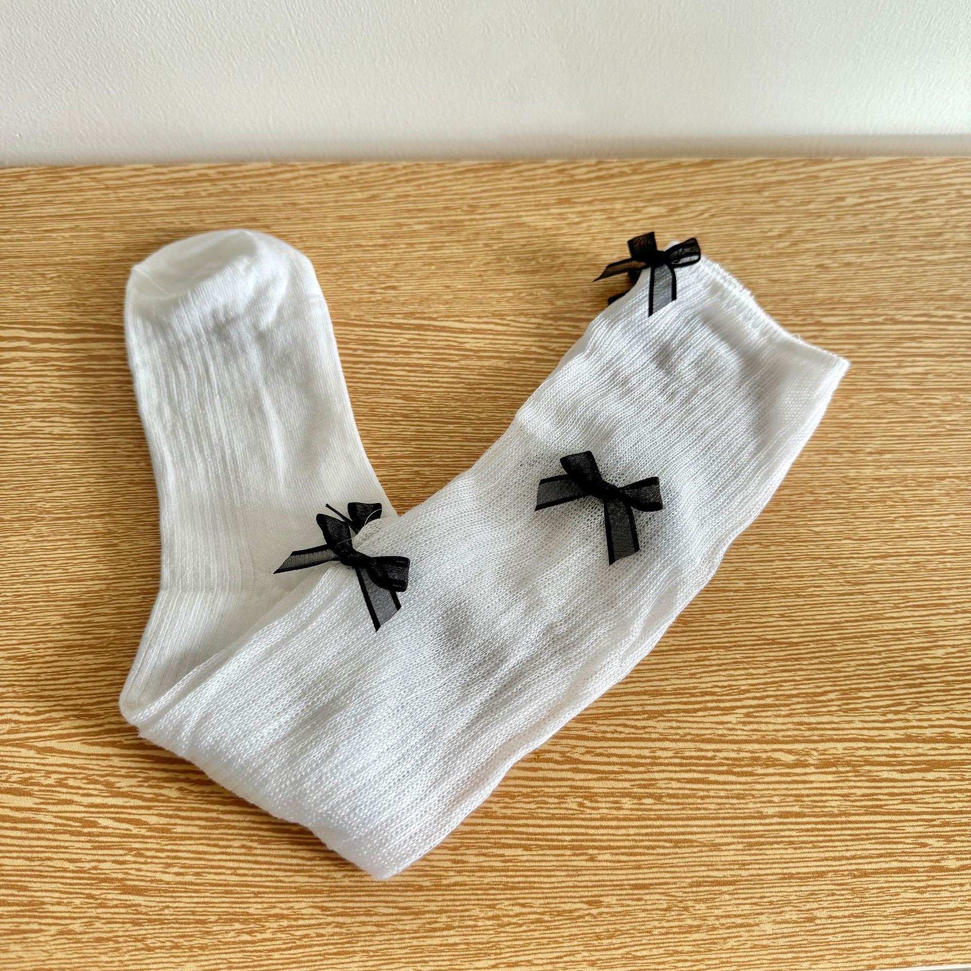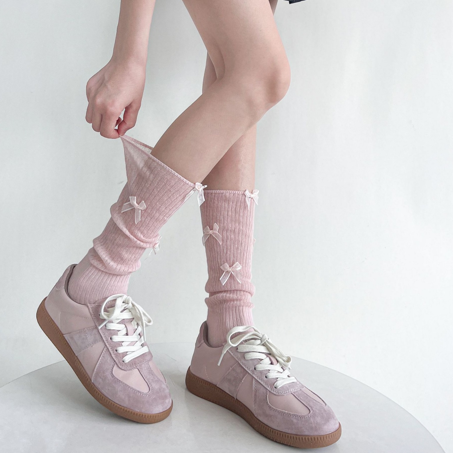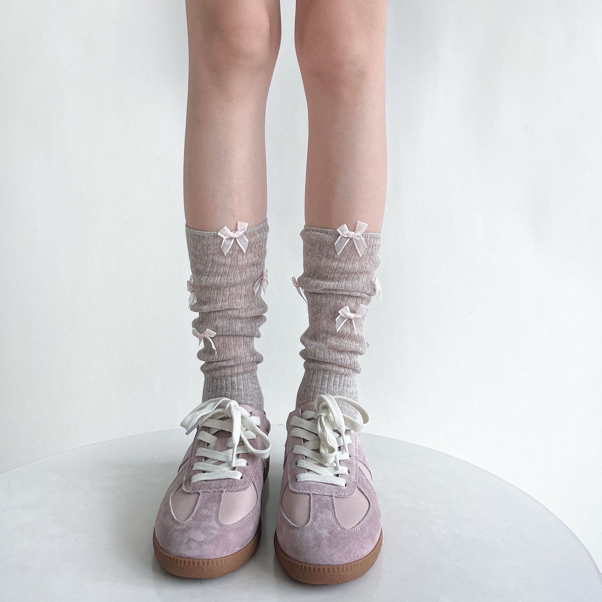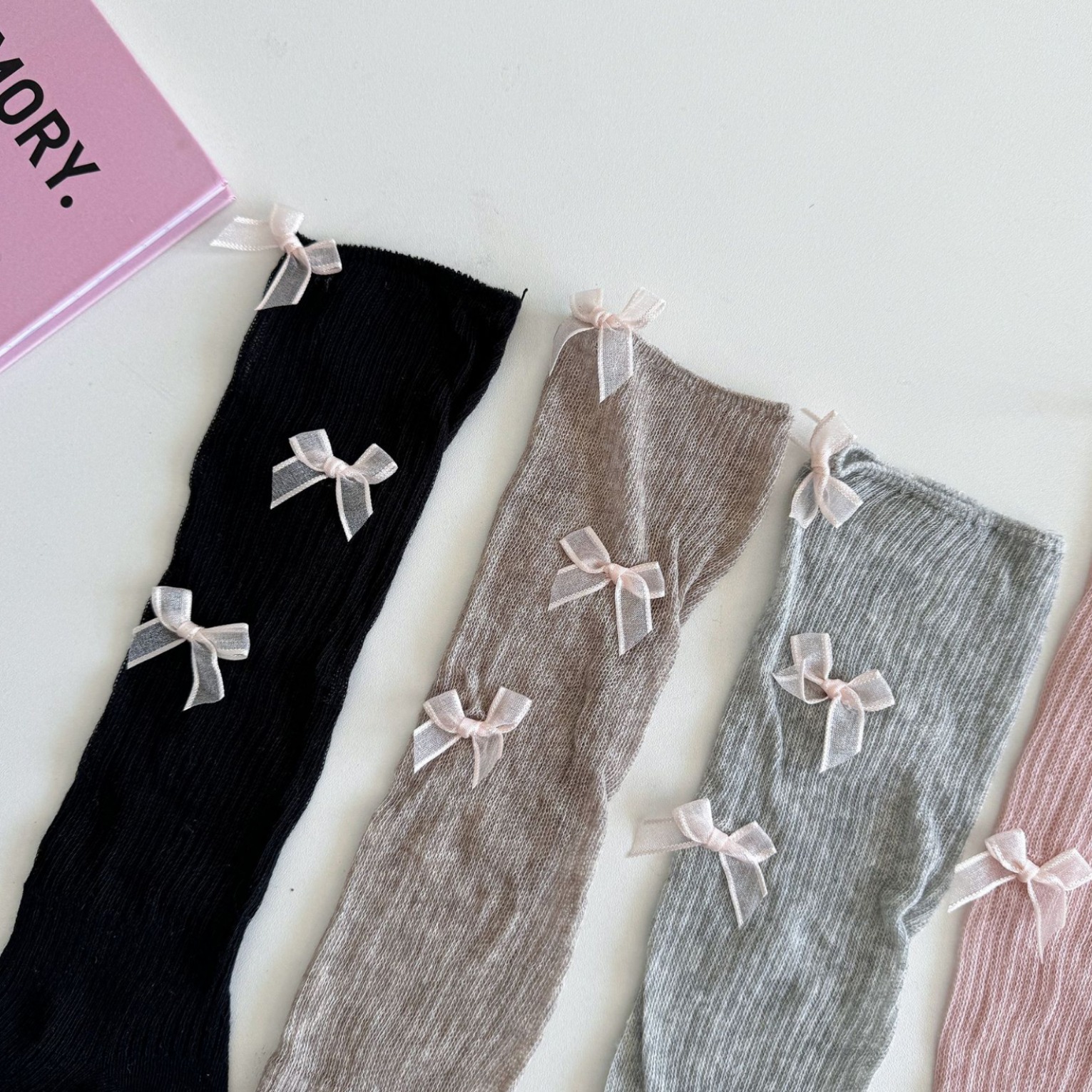 夏季薄款竖纹堆堆小腿袜纯色中筒袜粉嫩蝴蝶结日系简约百搭jk袜子