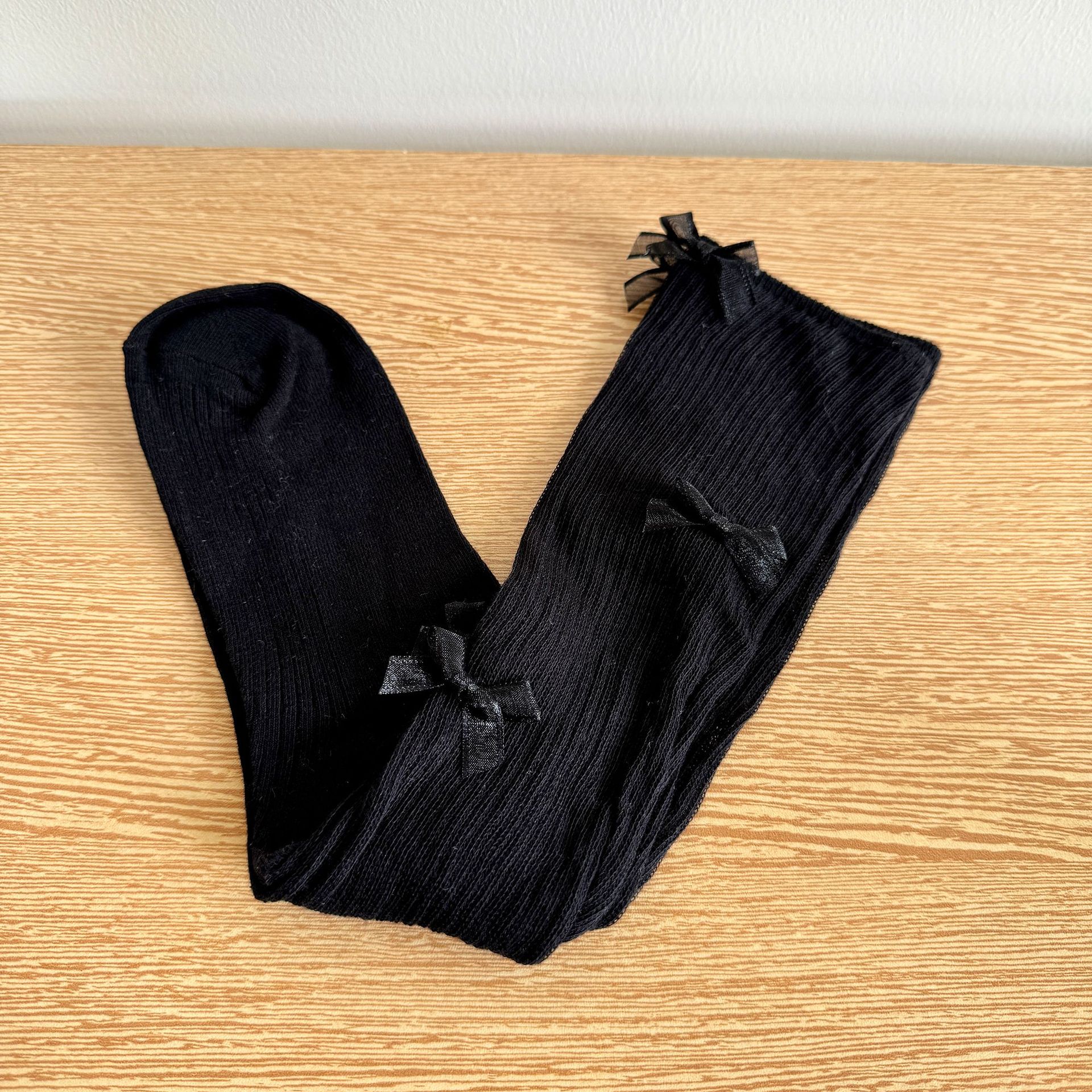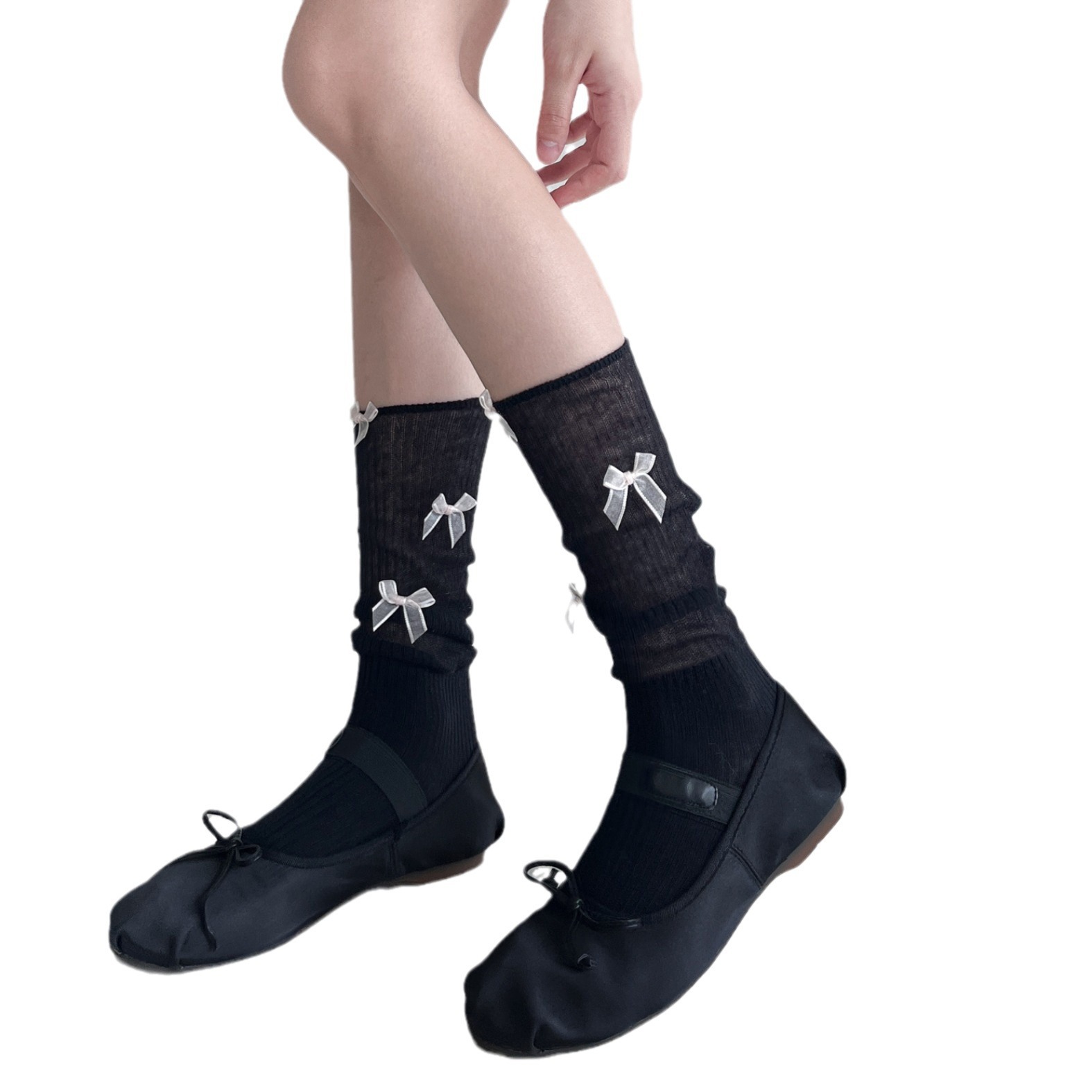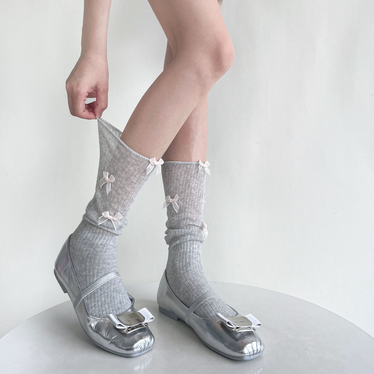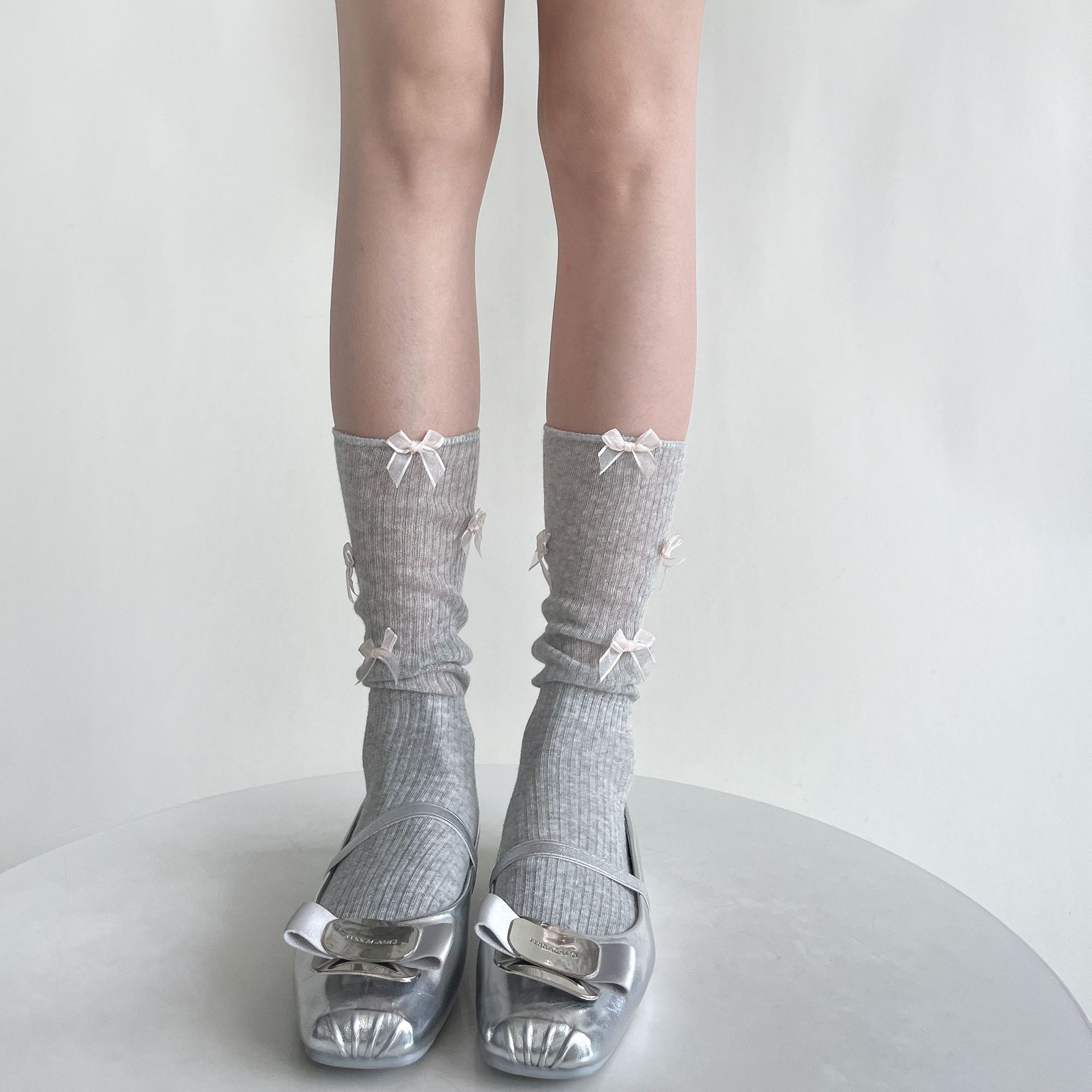 夏季薄款竖纹堆堆小腿袜纯色中筒袜粉嫩蝴蝶结日系简约百搭jk袜子