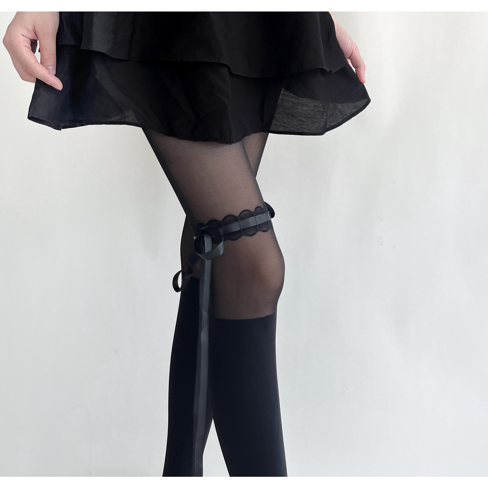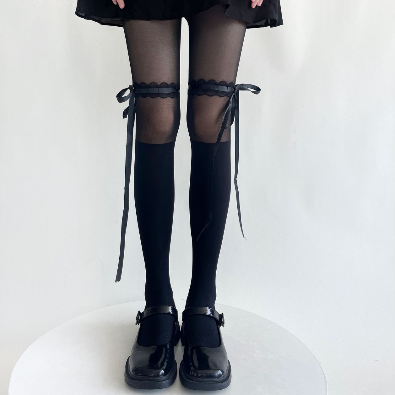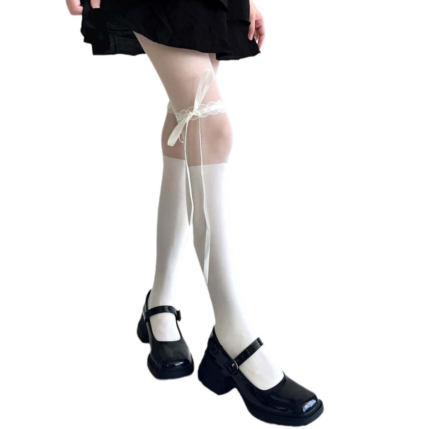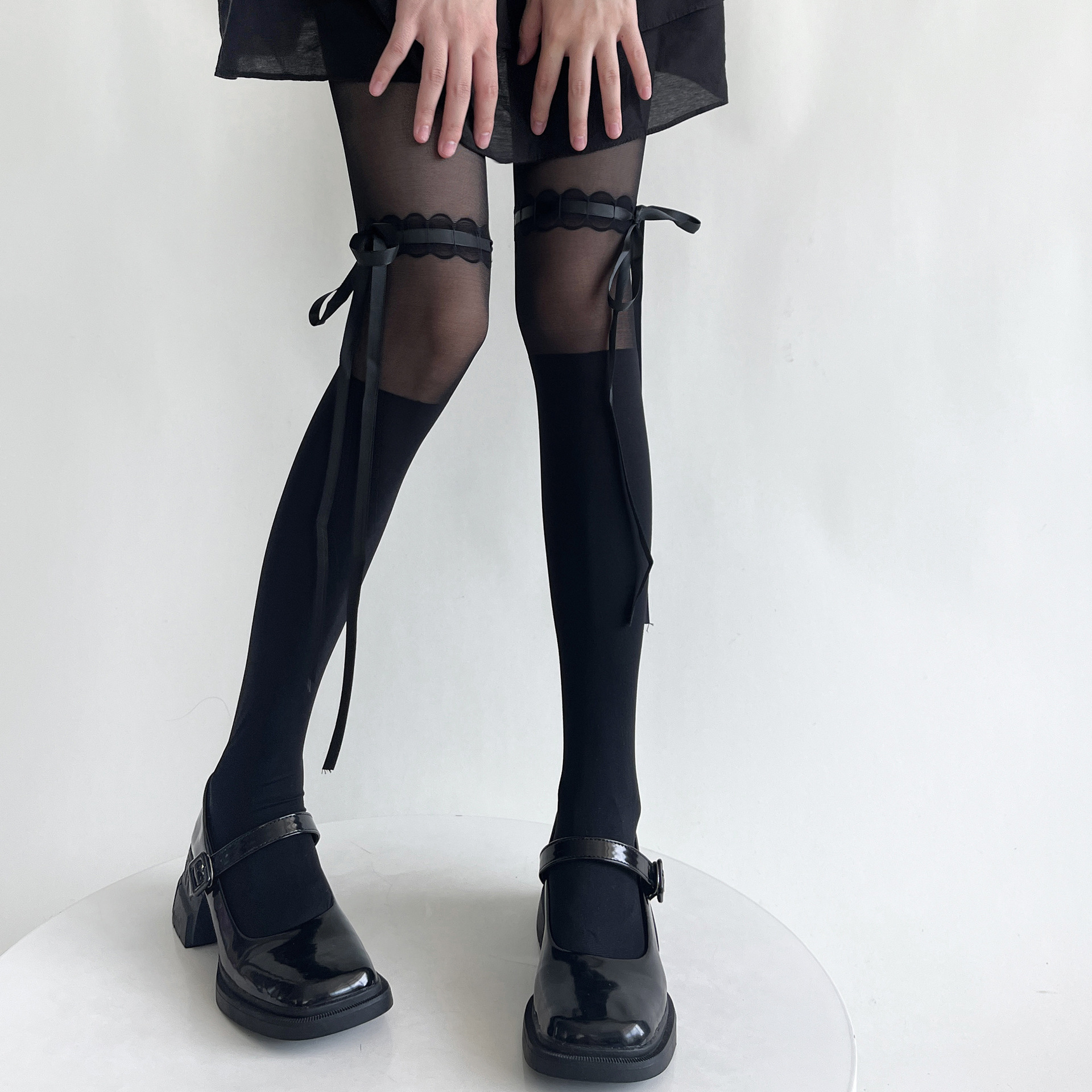 Lolita蝴蝶结绑带丝袜甜美芭蕾风纯欲奶白色拼接连裤袜薄款黑色女