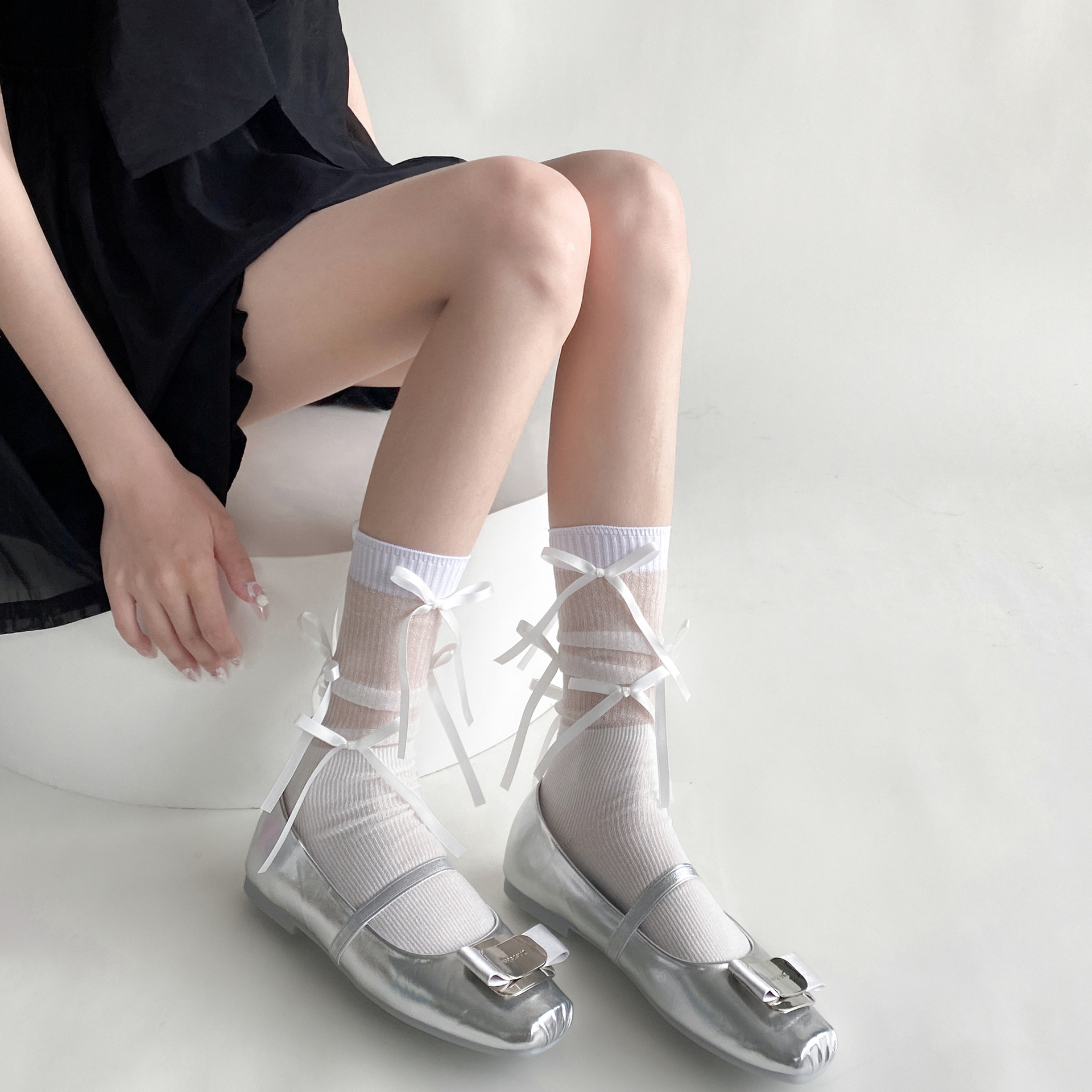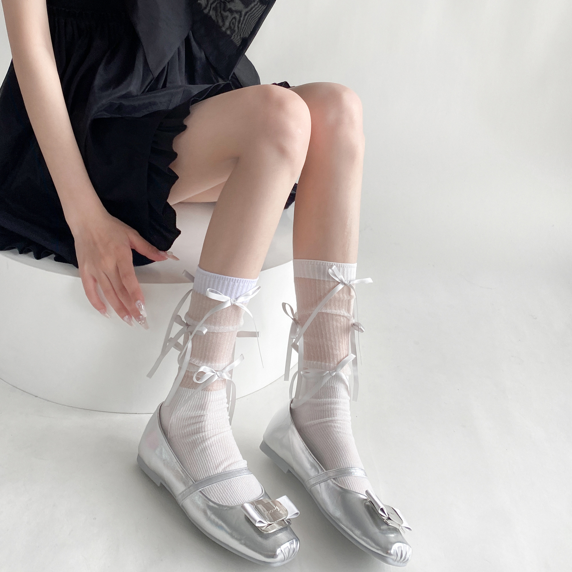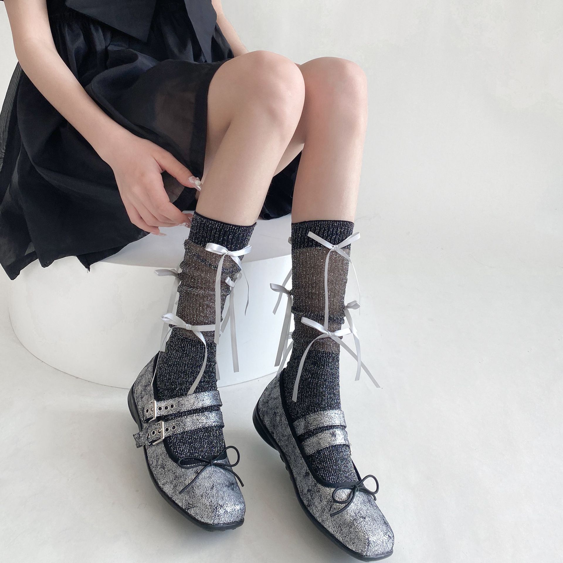 春夏季薄款微透亮丝堆堆袜小腿袜设计感蝴蝶结小众中筒袜女ins潮