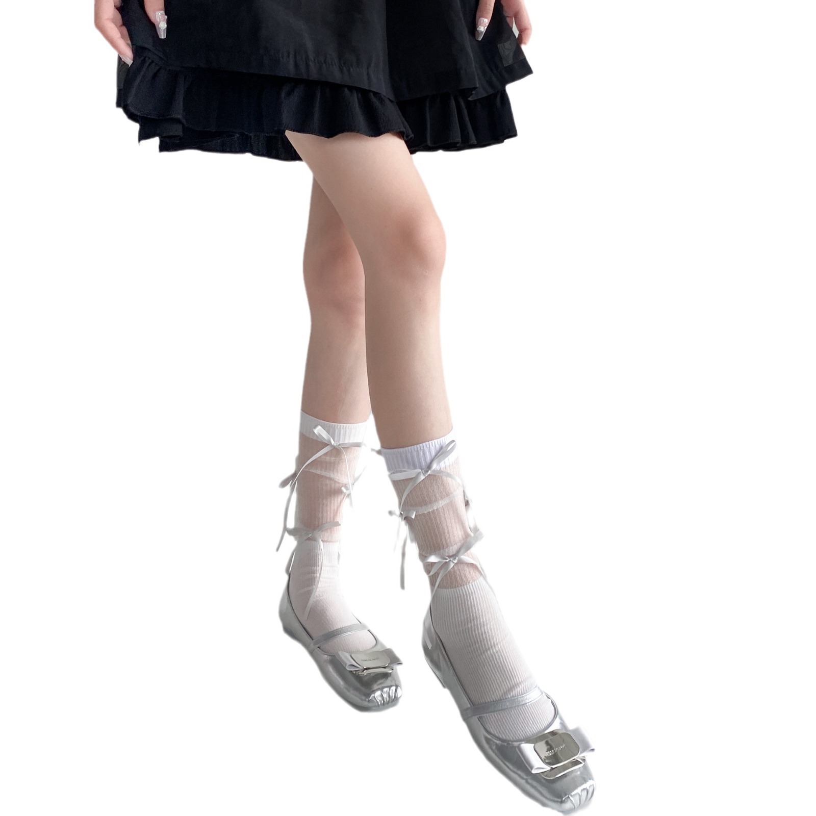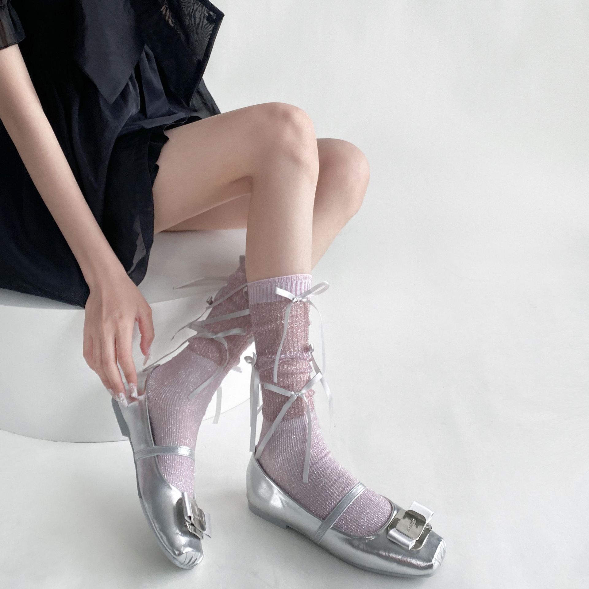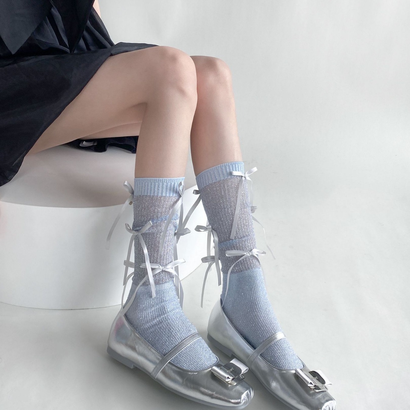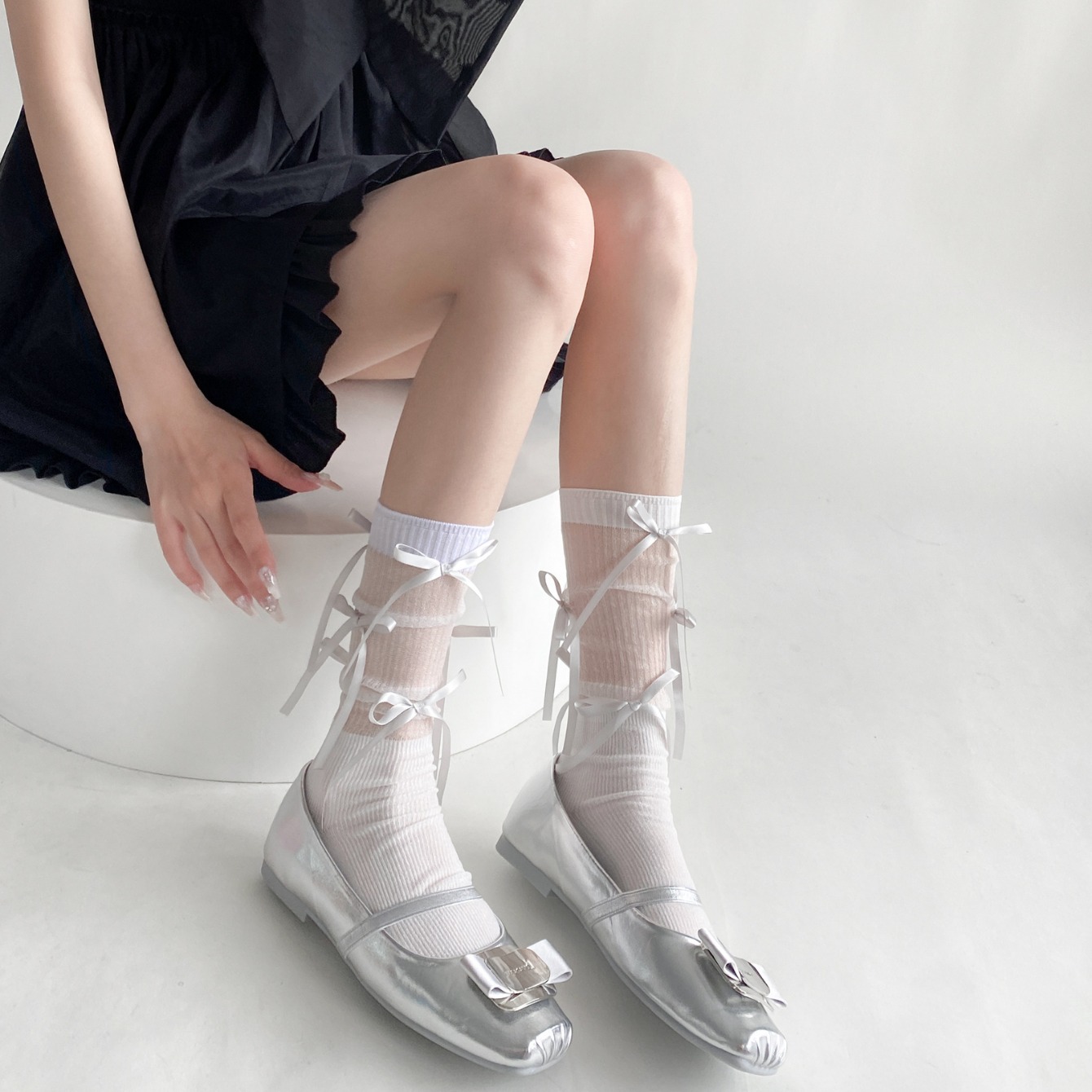 春夏季薄款微透亮丝堆堆袜小腿袜设计感蝴蝶结小众中筒袜女ins潮