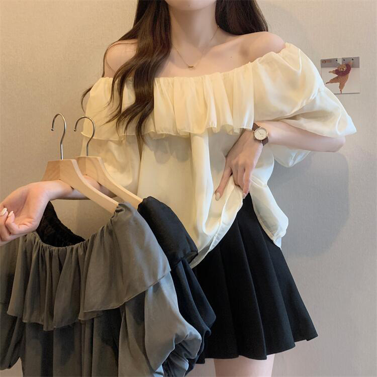 大码胖MM时尚性感一字肩荷叶边短袖雪纺衫女夏小众设计感显瘦上衣