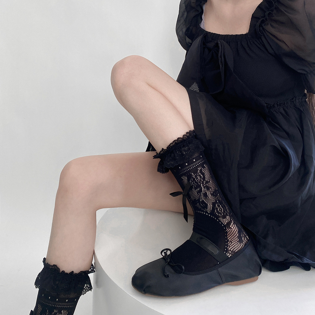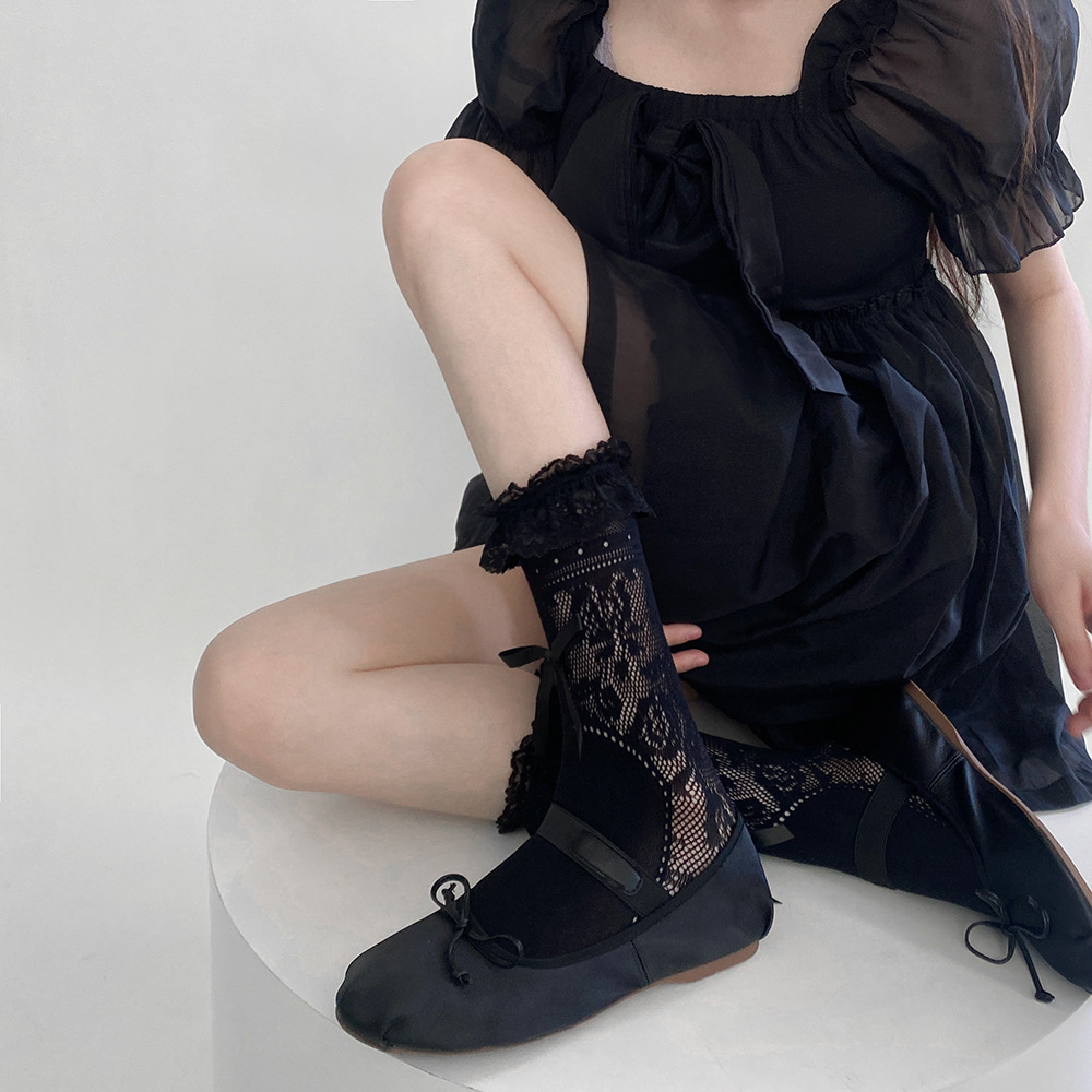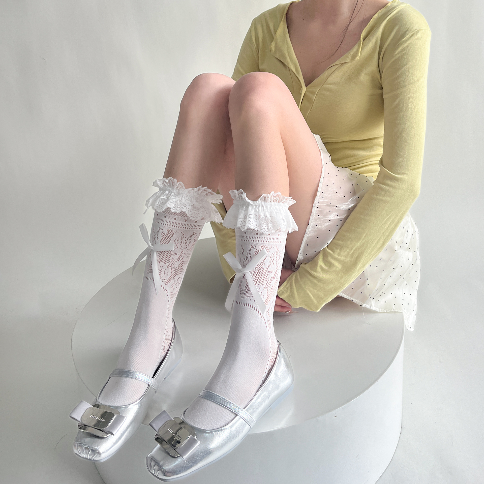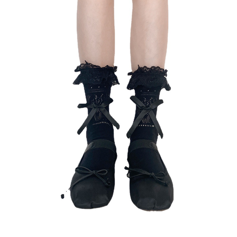 春夏y2k短袜女芭蕾舞风蕾丝花边蝴蝶结中筒袜薄款洛丽塔jk堆堆袜