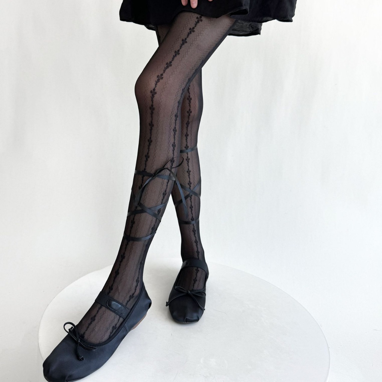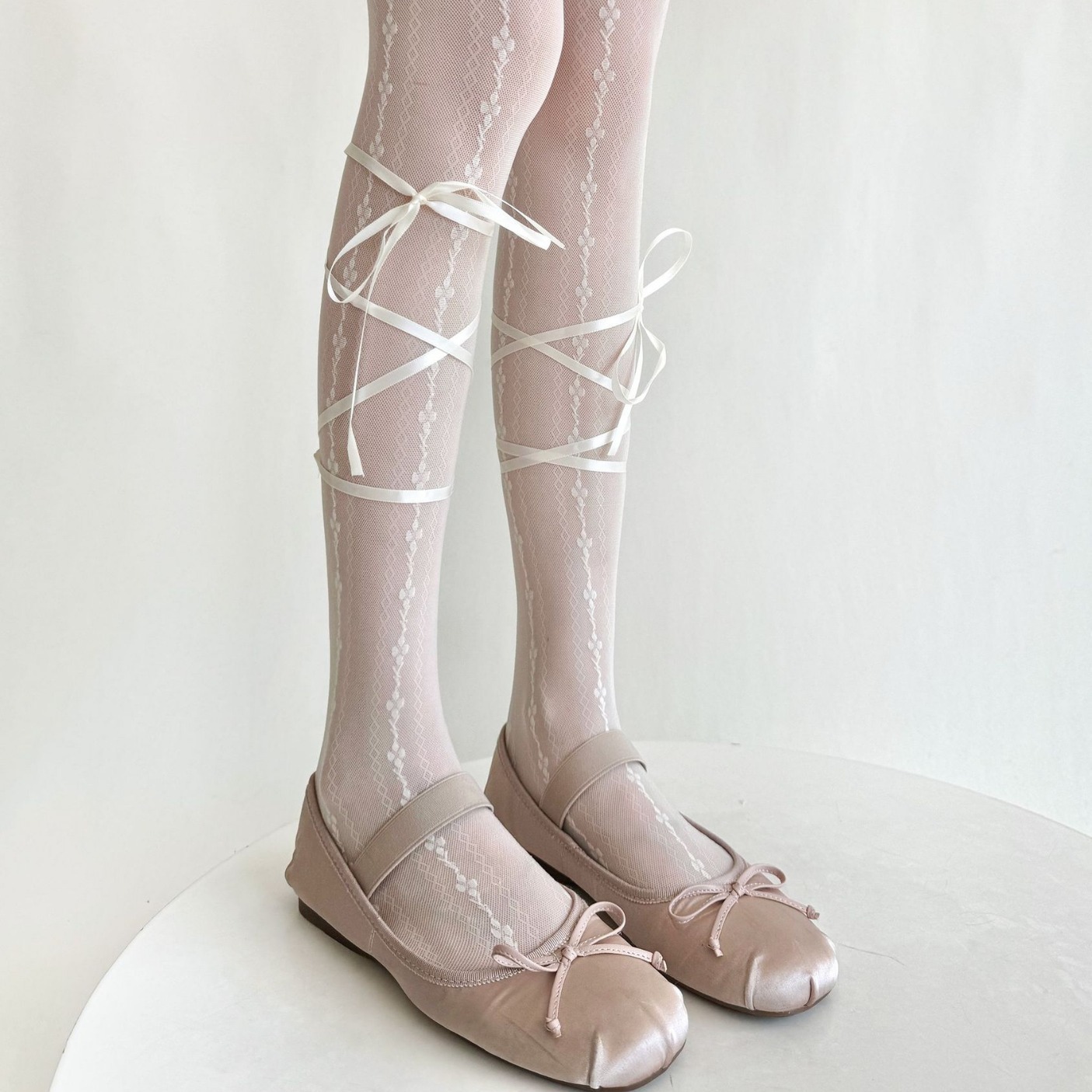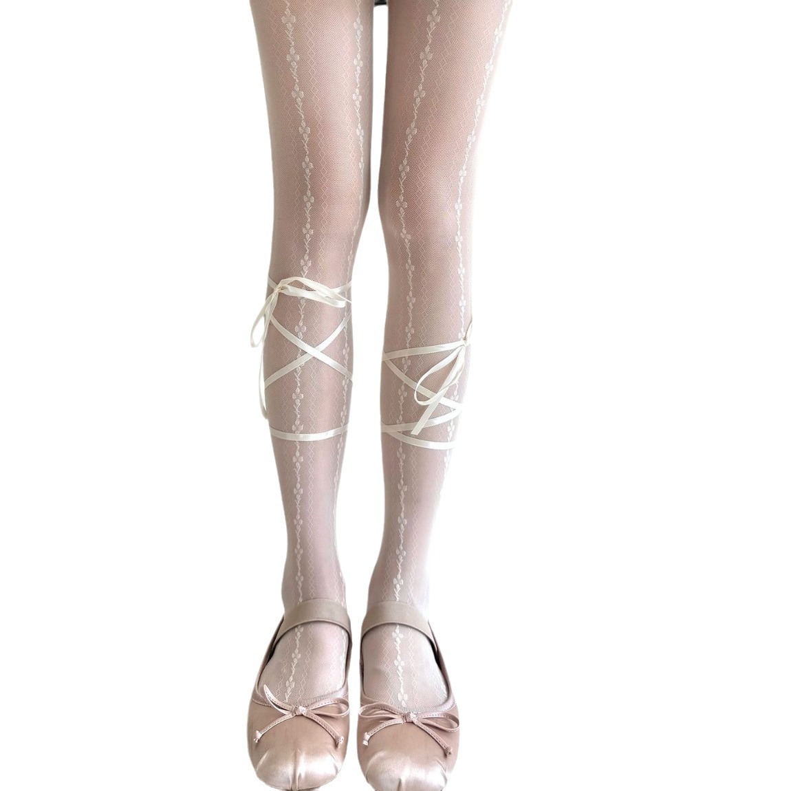 日系新品春夏甜美纯欲风奶白绑带四叶草丝袜芭蕾风少女美腿打底袜