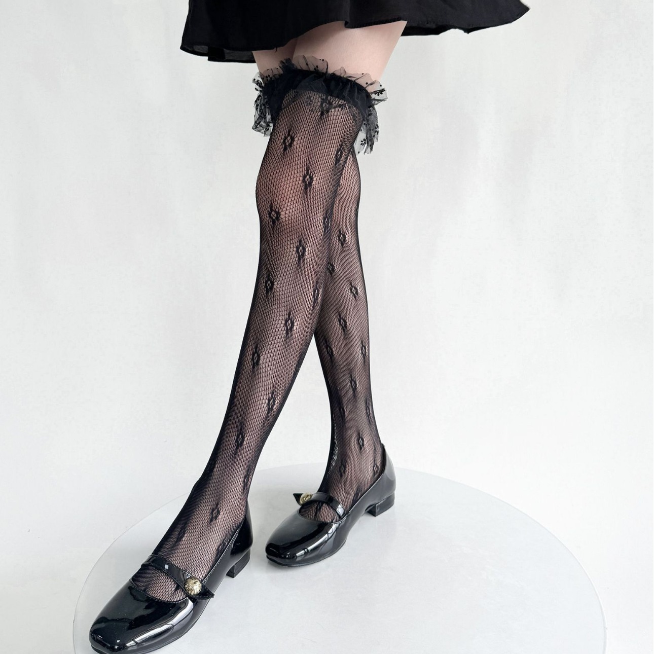 Lolita黑色纯欲风四叶草波点网纱花边蕾丝小腿袜女夏季镂空网袜