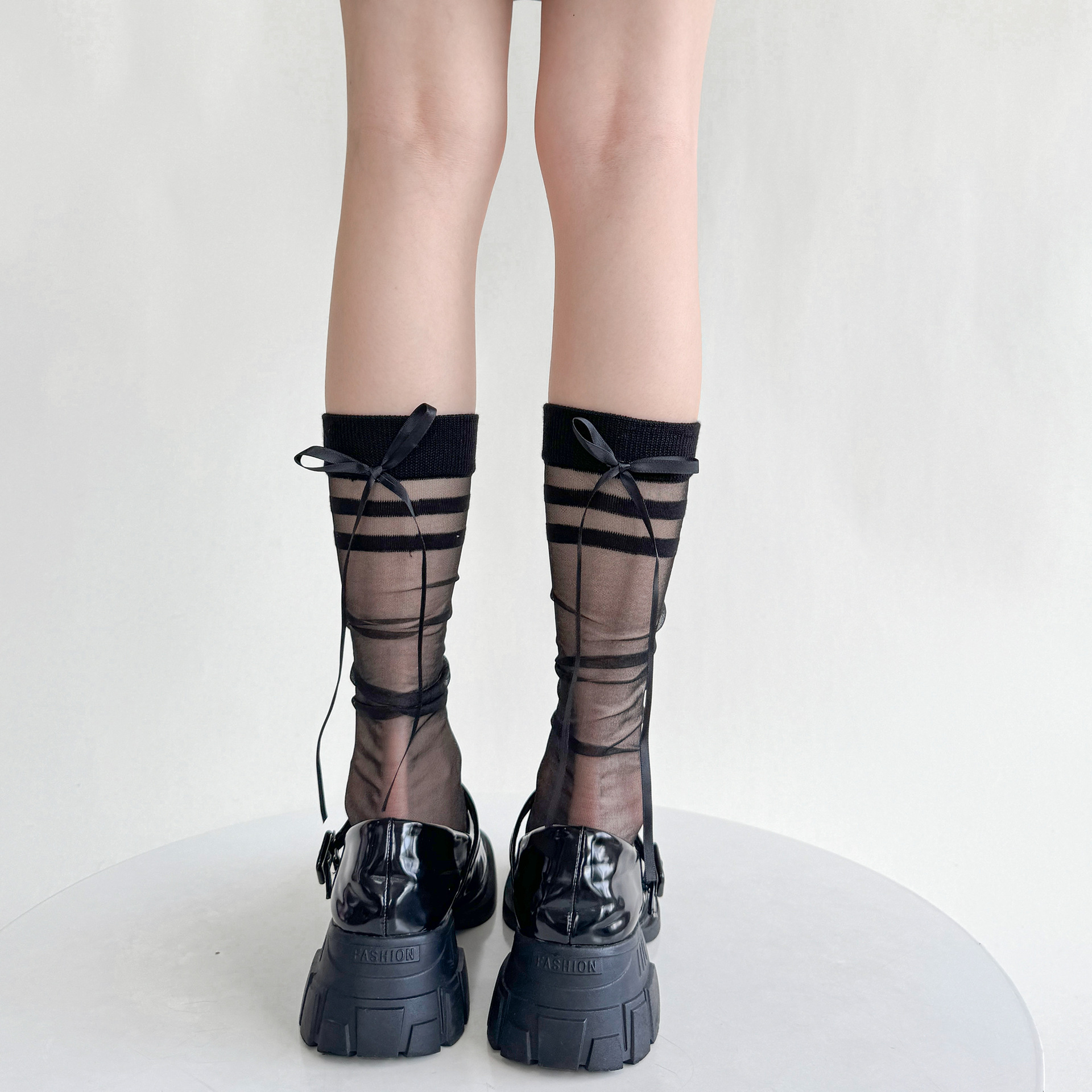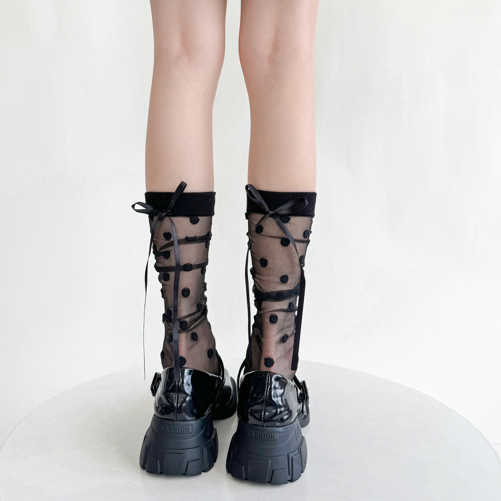 春夏季清凉穿搭超薄透肉玻璃丝波点双杠堆堆小腿袜黑白飘带蝴蝶结