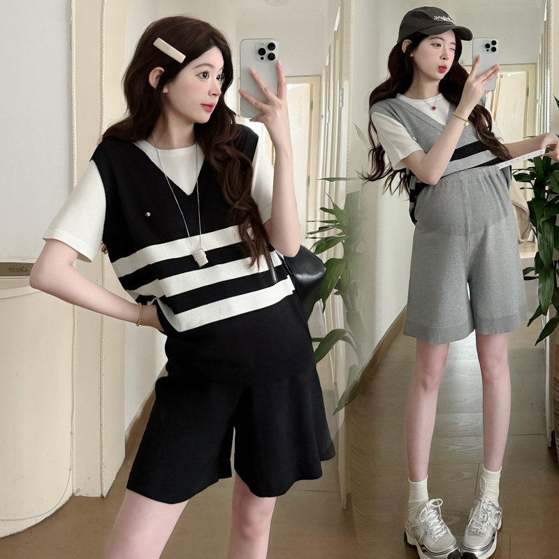 孕妇套装夏2025新款冰丝运动两件套条纹假两件上衣短裤