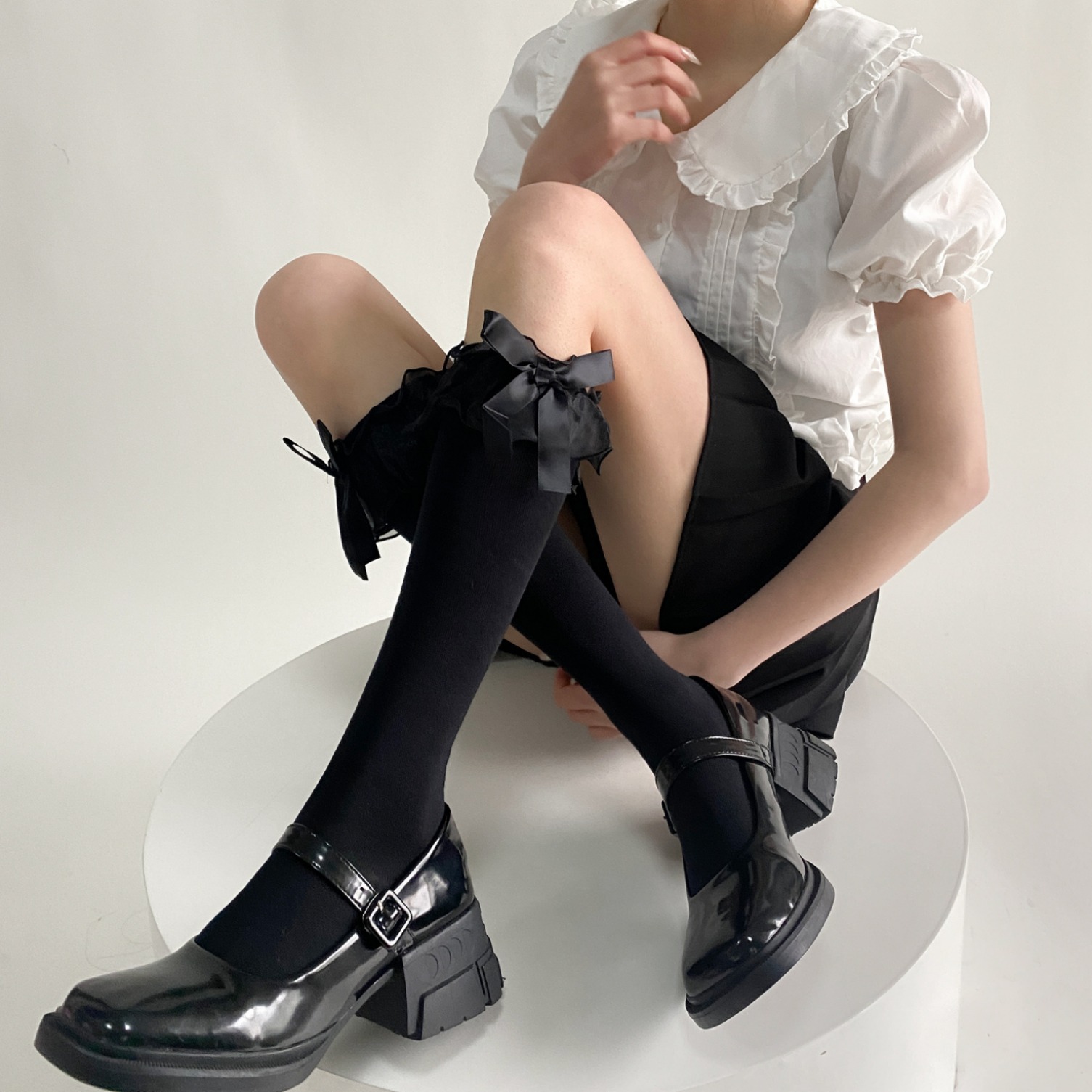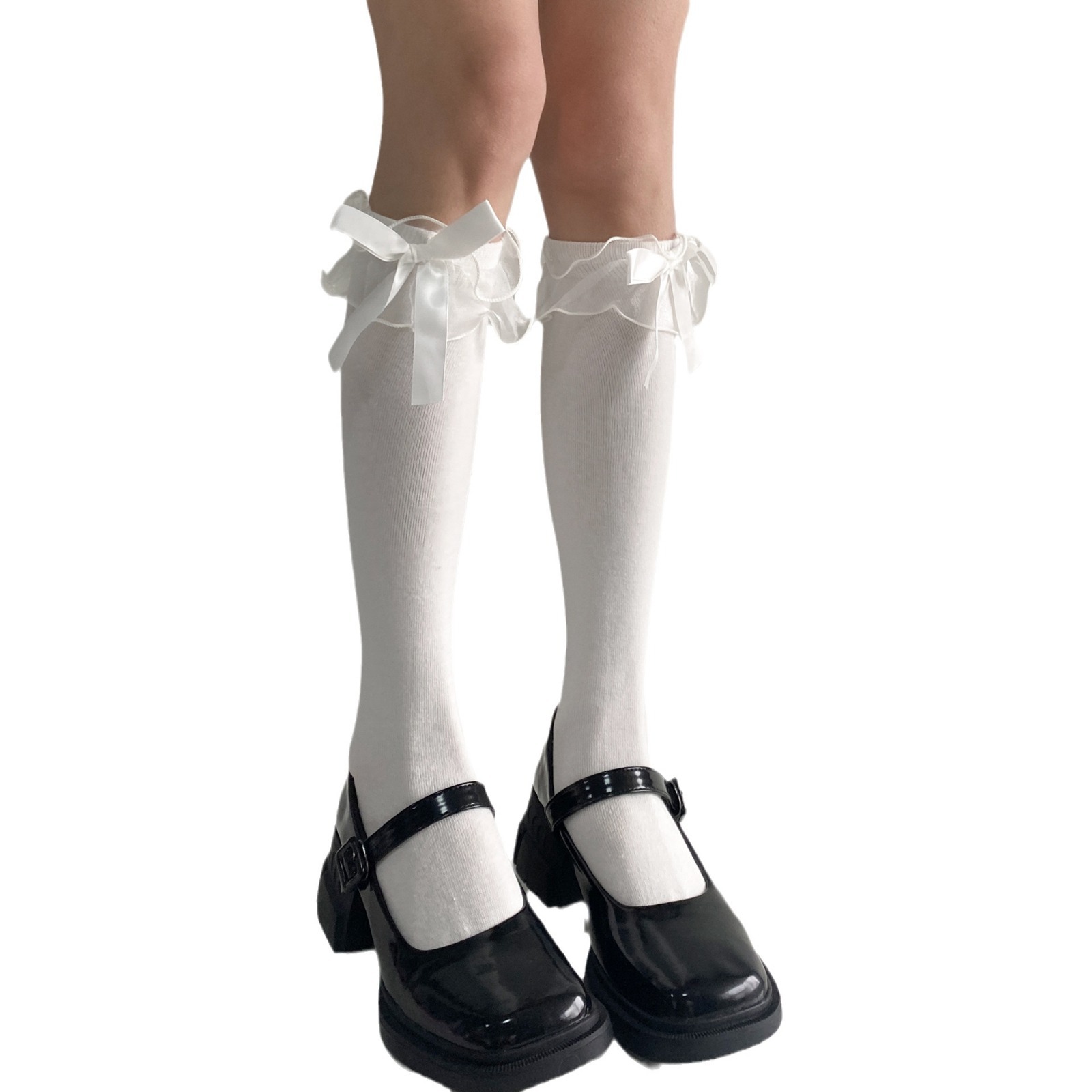 日系春秋可爱奶白色蝴蝶结欧根纱蓬蓬花边针织棉小腿袜子女甜美风