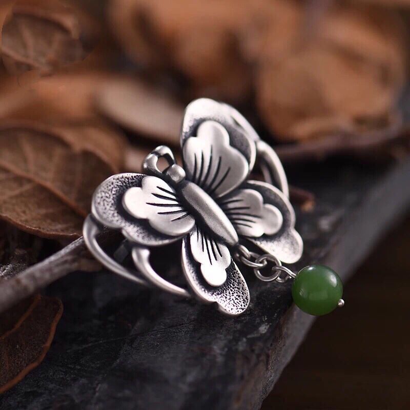 S925纯银胸针中国风碧玉蝴蝶领针复古胸花吊坠丝巾扣老银匠手工