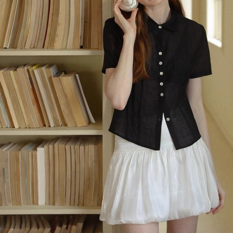半透收腰衬衫压褶复古法式贝壳扣休闲优雅外搭上衣衬衣女夏新款