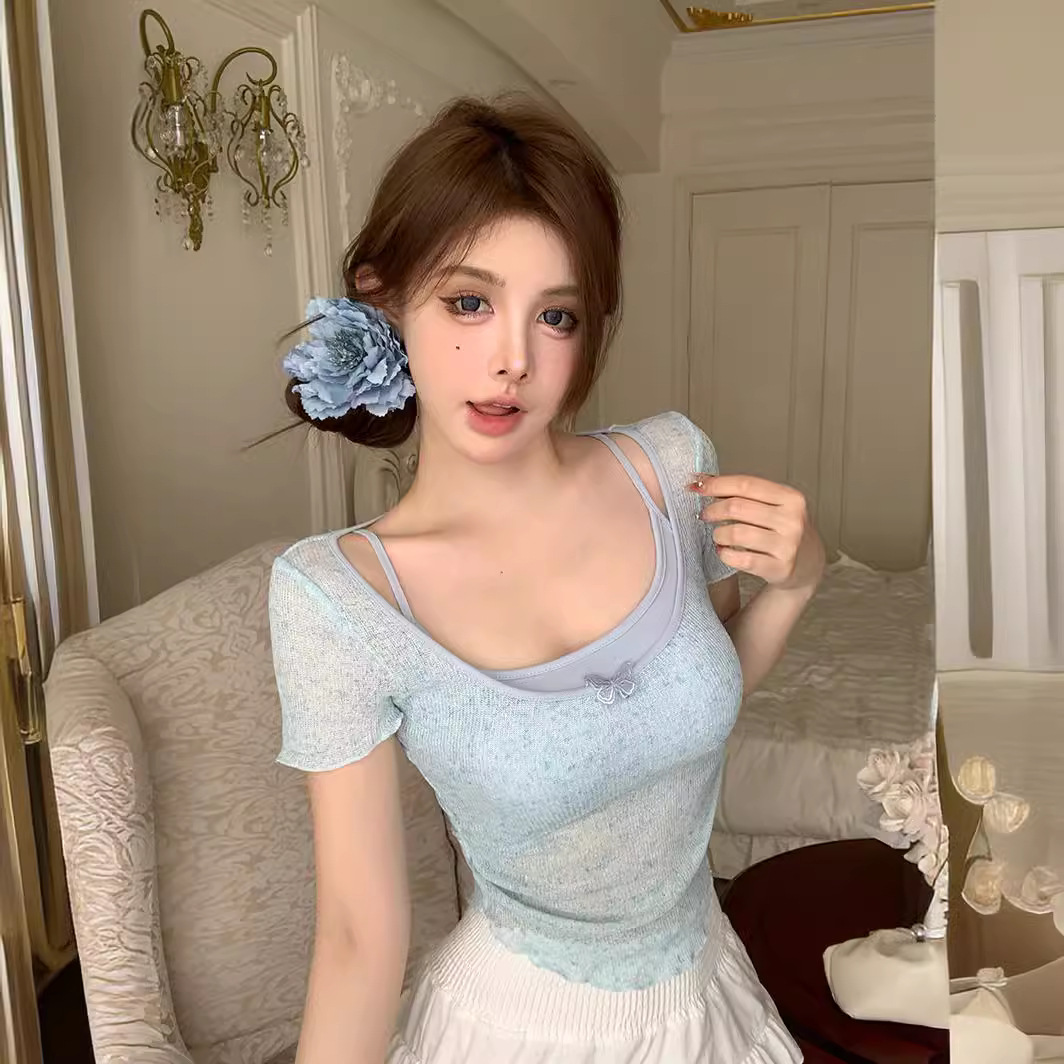 纯欲薄款微透蓝色短袖T恤女夏季带胸垫吊带小背心上衣叠穿两件套