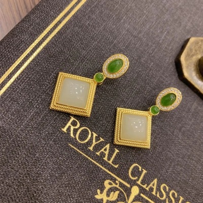 镀925银镶嵌岭南白玉方形耳钉丽人耳坠碧玉简约百搭素雅清新女款