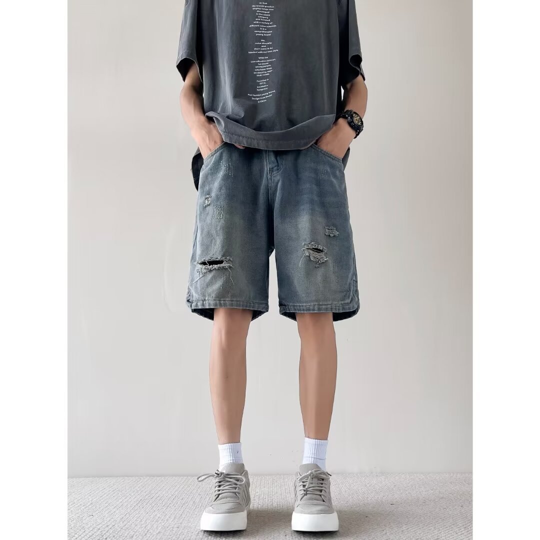 破洞牛仔短裤男夏季薄款美式高街潮牌外穿直筒裤痞帅休闲五分裤子
