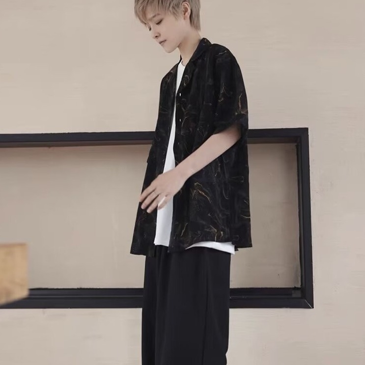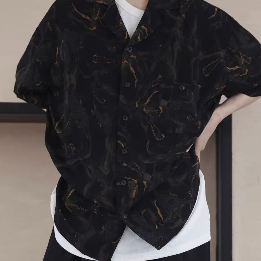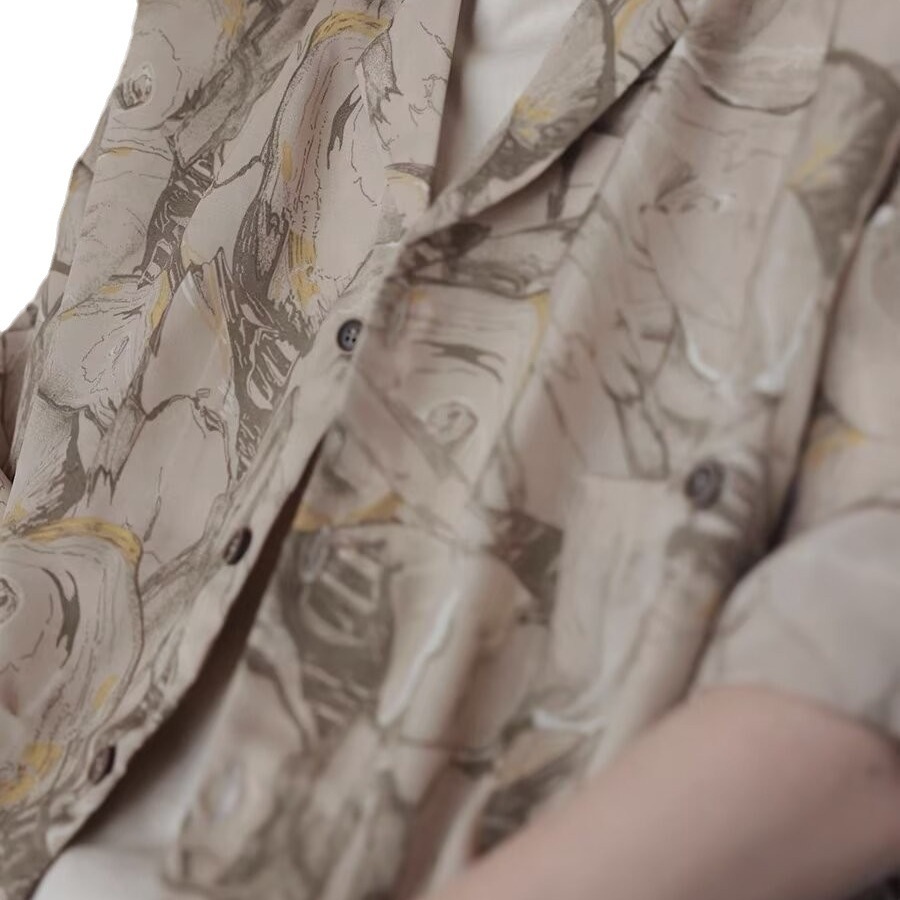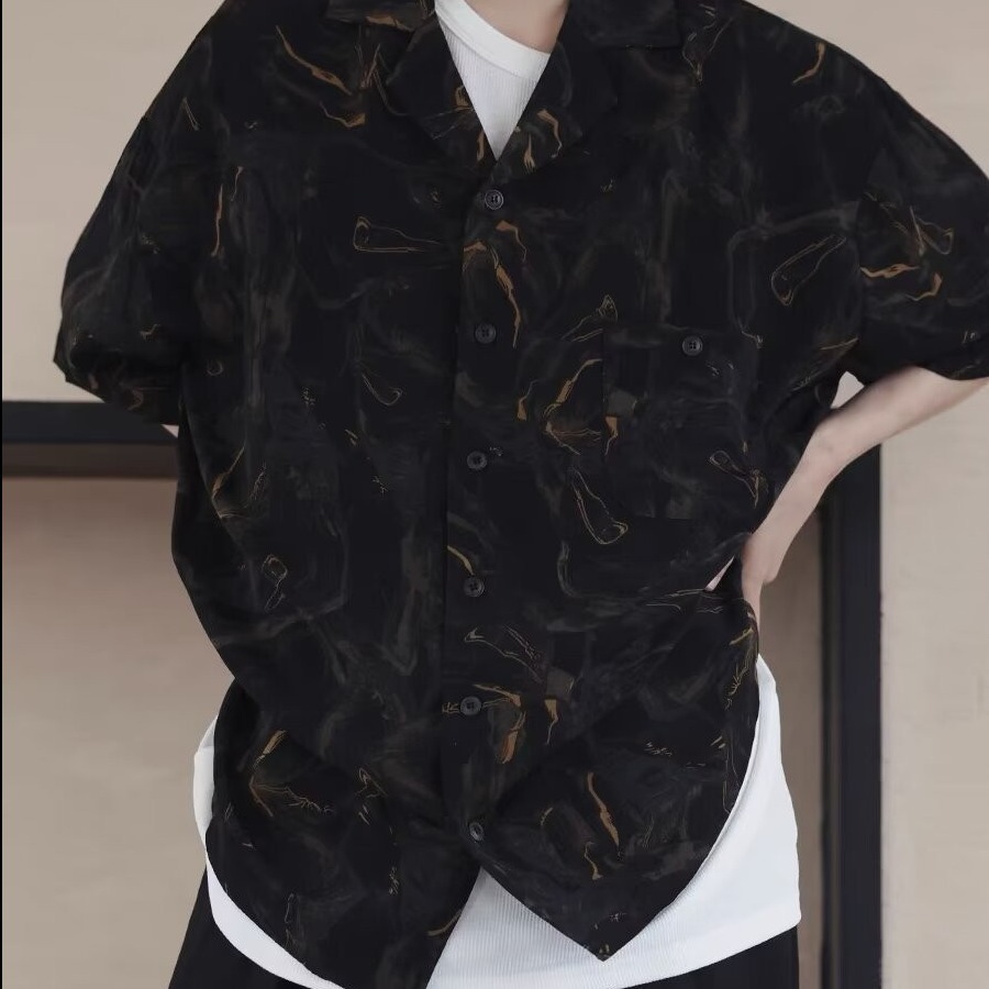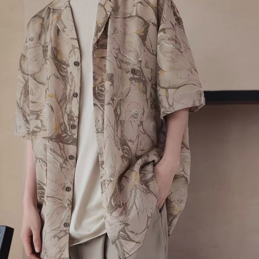 夏季日系复古慵懒风线条几何短袖衬衫清凉松弛感宽松休闲衬衣外套