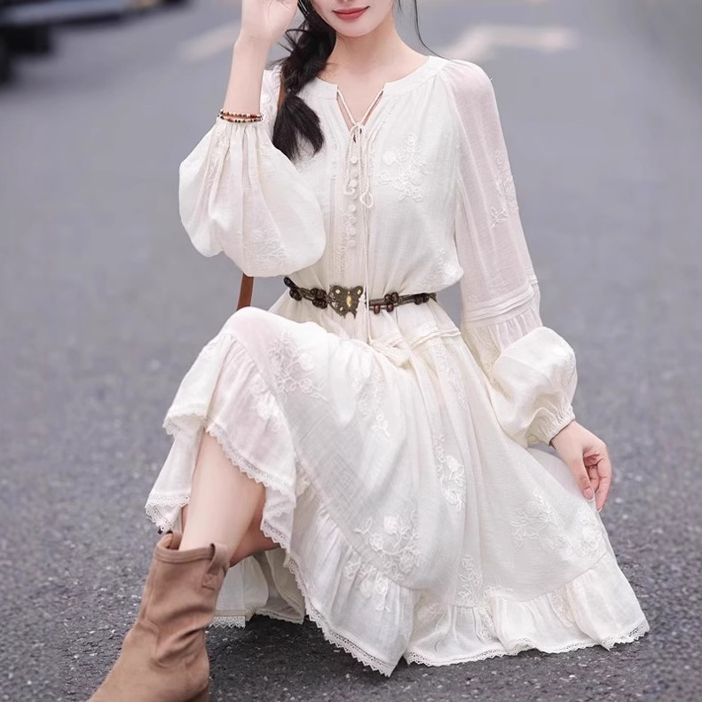品质推荐~刺绣V领流苏系带花边连衣裙女夏季气质高级质感新款