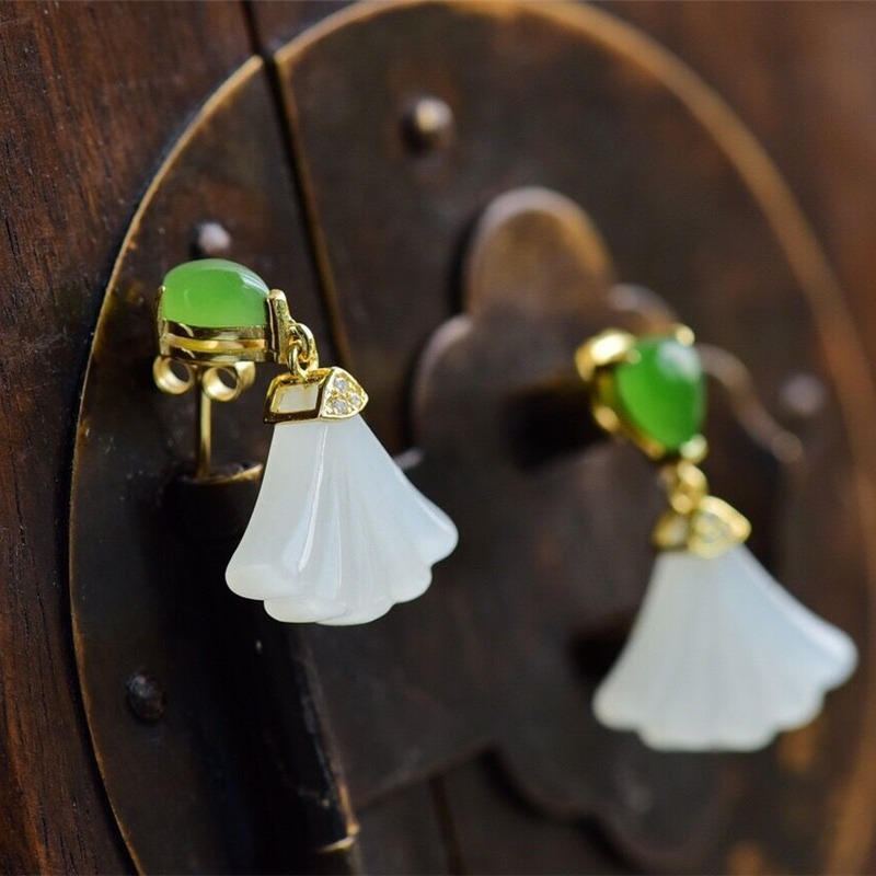 s925银镶和田玉耳钉天然白玉银杏叶搭配碧玉点缀感耳钉