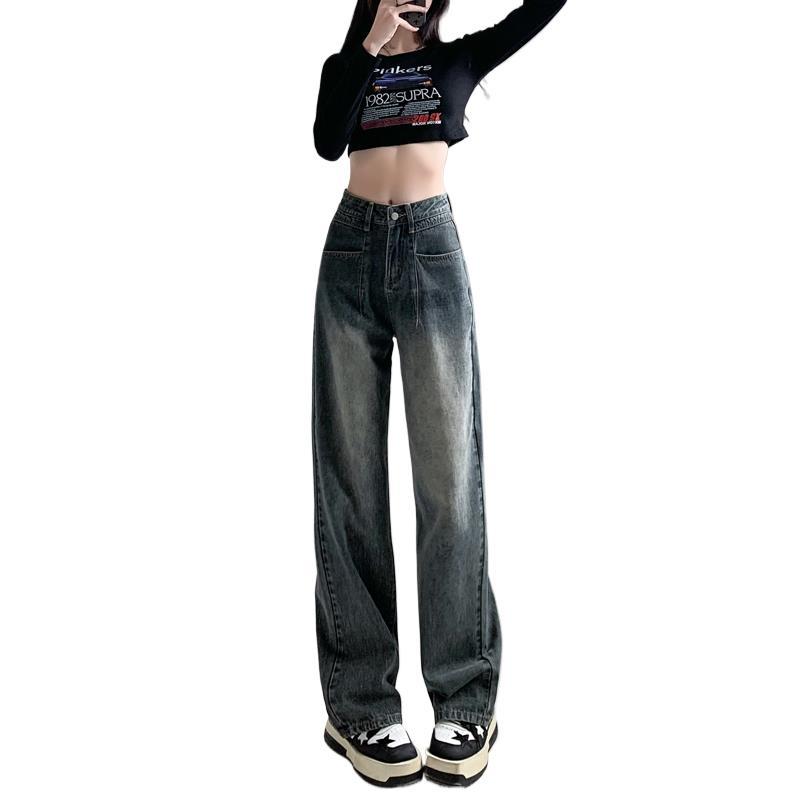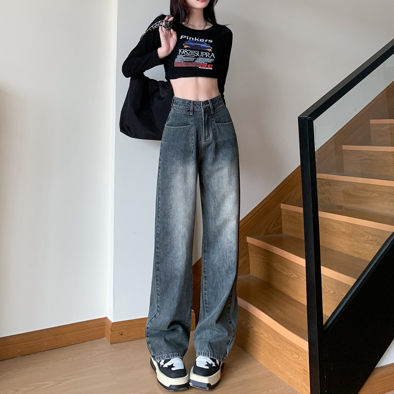 牛仔裤女年新款春装美式高街宽松直筒显瘦高腰复古阔腿裤