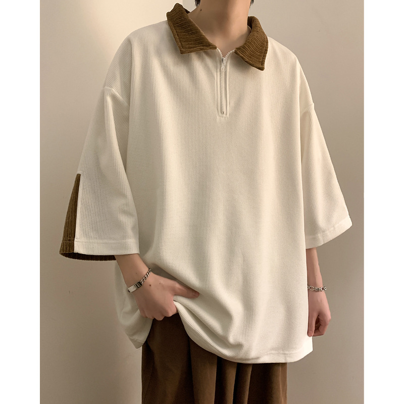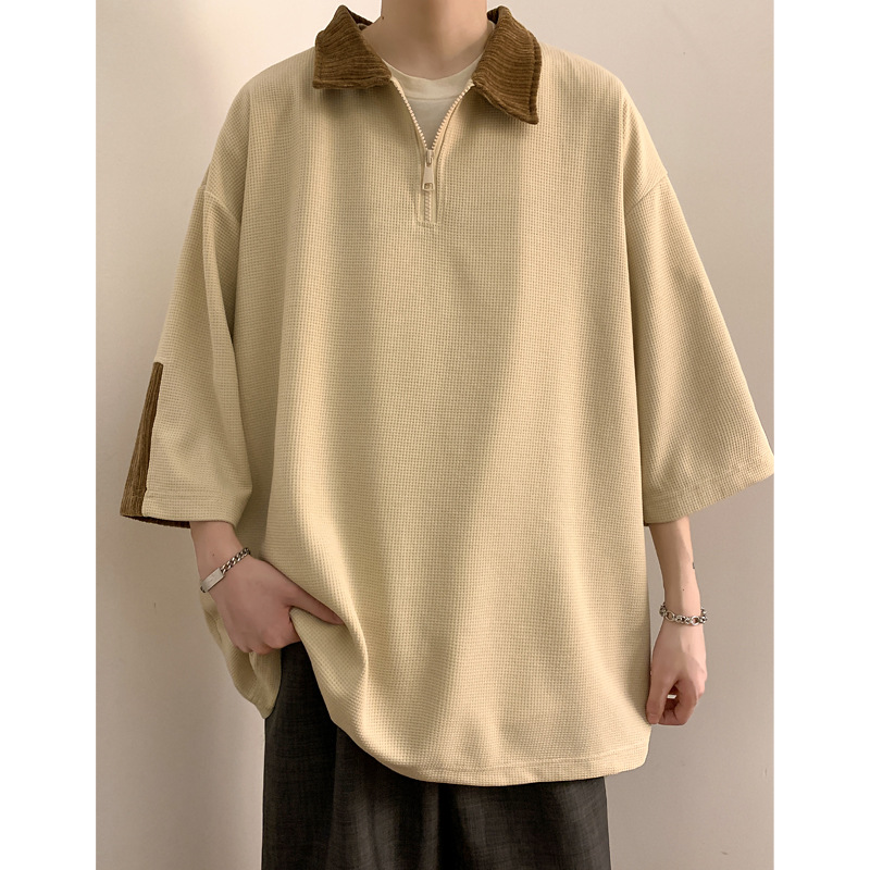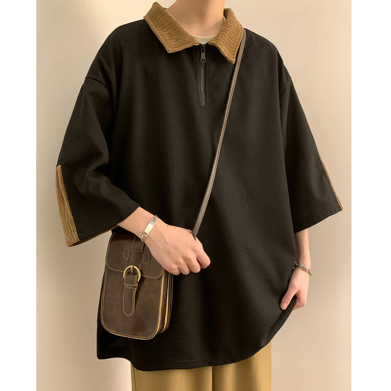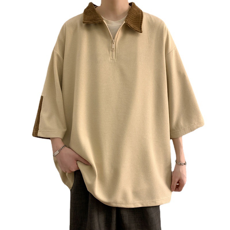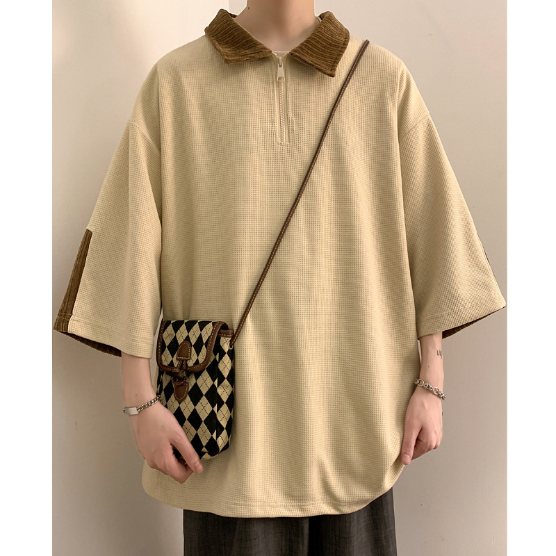 撞色polo衫男款美式半拉链卫衣hiphop潮牌短袖夏季正肩七分袖t恤