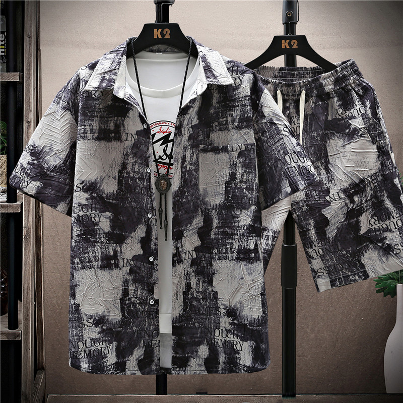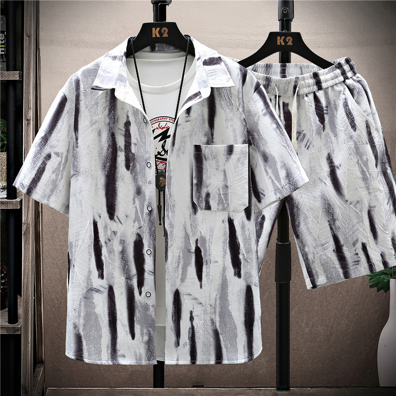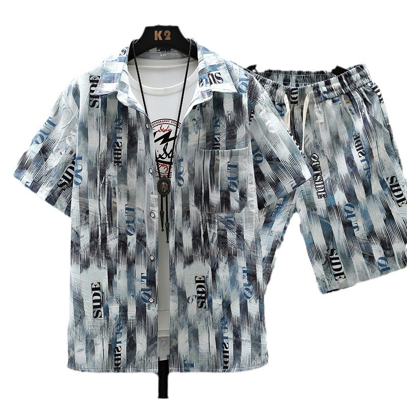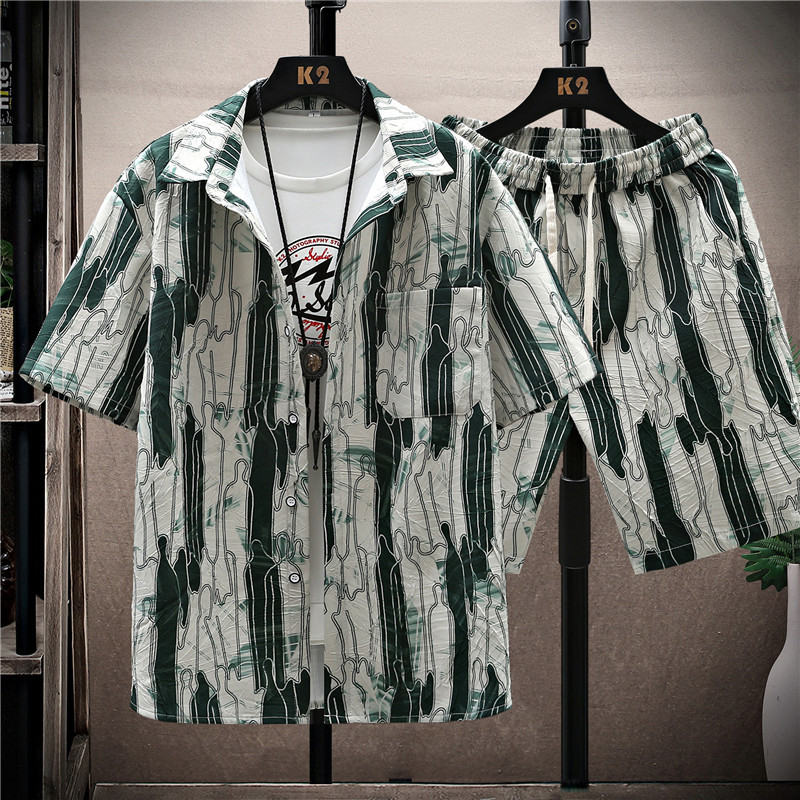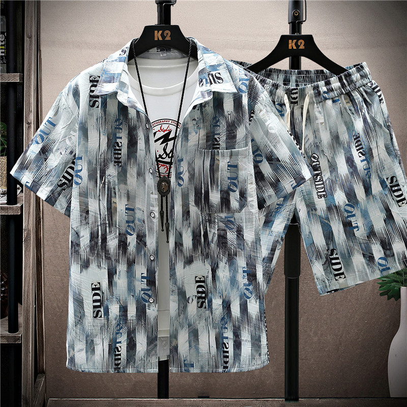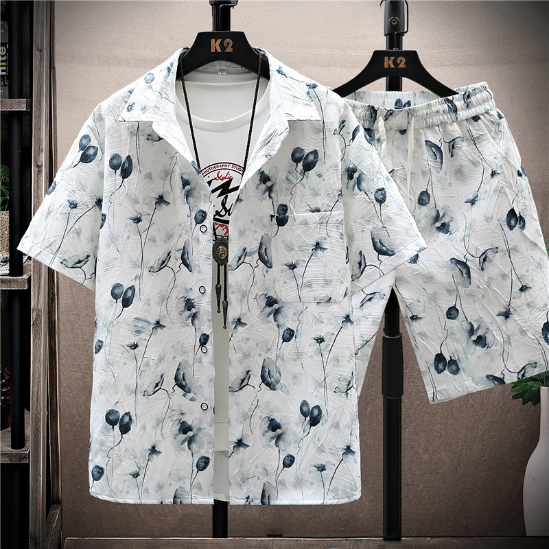 新款休闲时尚青少年男士潮流男装短袖花衬衫套装
