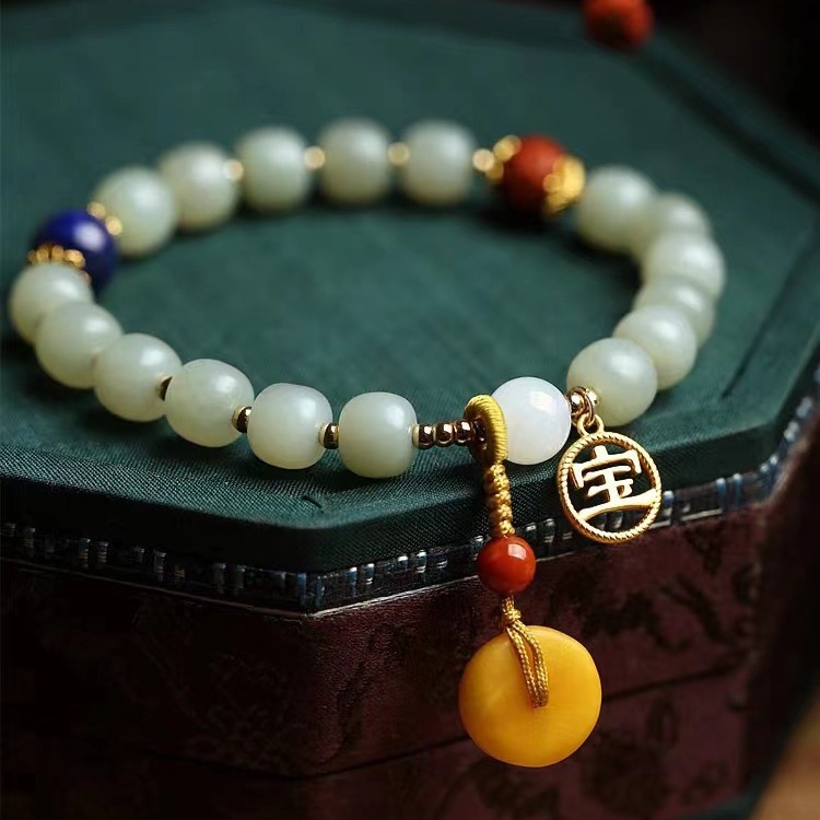 天然和田玉且末蓝手链女老蜜蜡平安扣玉石串珠珠子多宝手串