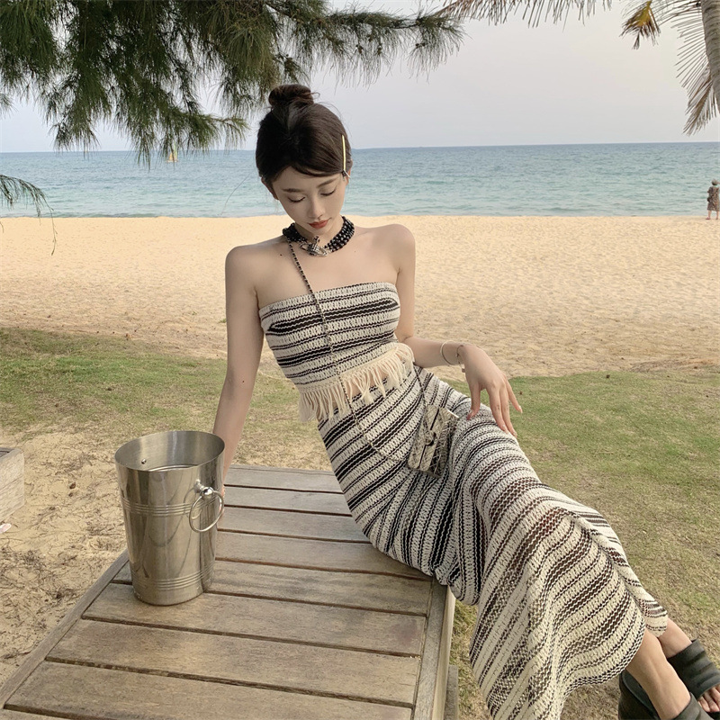 夏季新款法式气质流苏边黑白条纹针织抹胸背心半身裙套装女