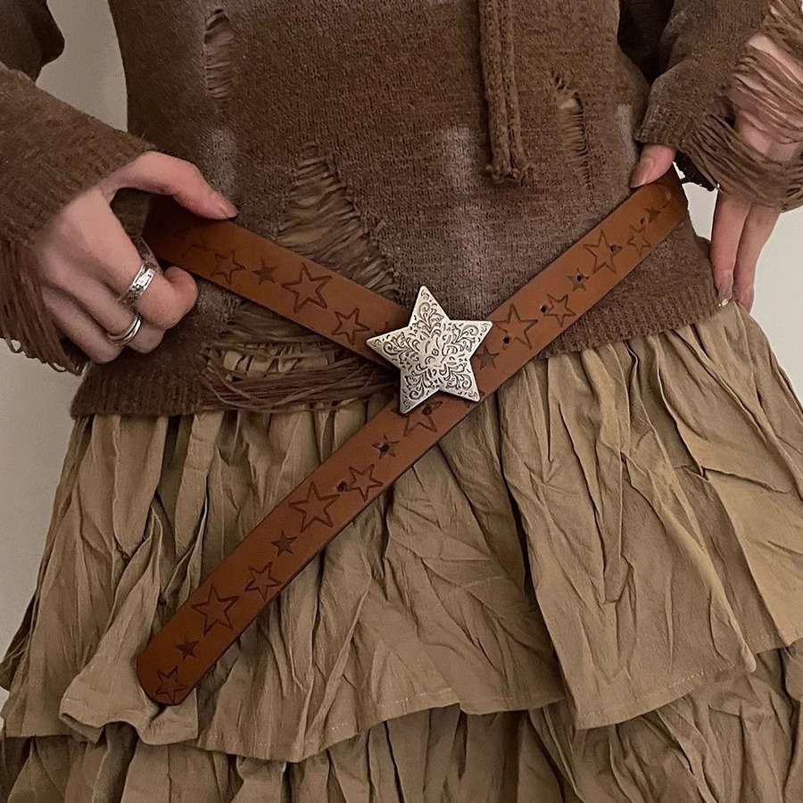 设计感腰带女小众重工五角星扣质感印花美式复古辣妹风休闲皮带女