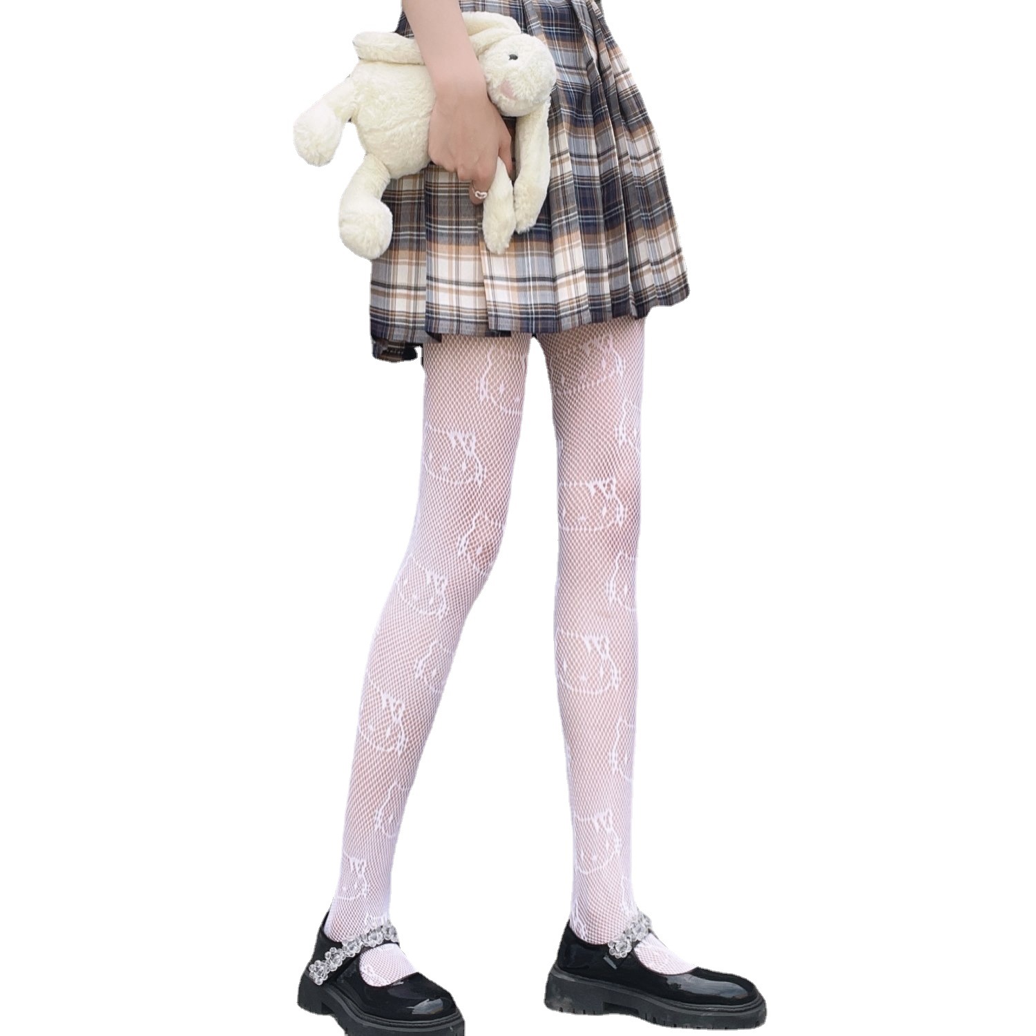 日系ins猫咪提花镂空渔网袜暗黑丝袜JK萝莉少女薄款白丝学生打底
