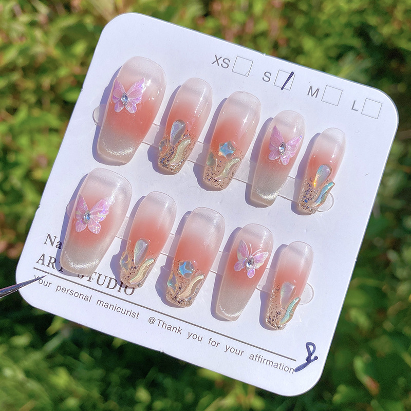 纯手工穿戴甲冰晶蝴蝶柔美猫眼少女甜美美甲可拆卸甲片