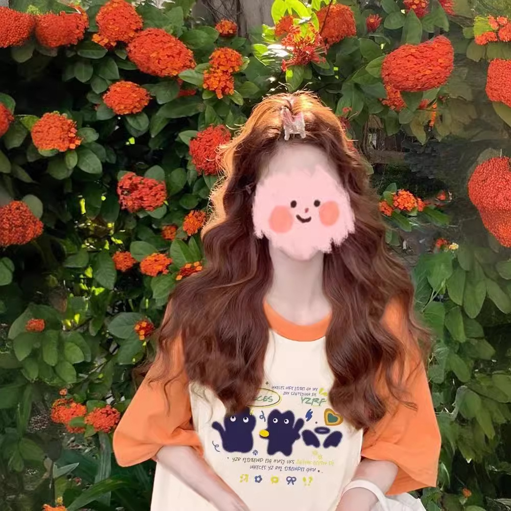 纯棉重磅撞色插肩短袖t恤女夏季新款潮牌宽松大码小众设计感上衣