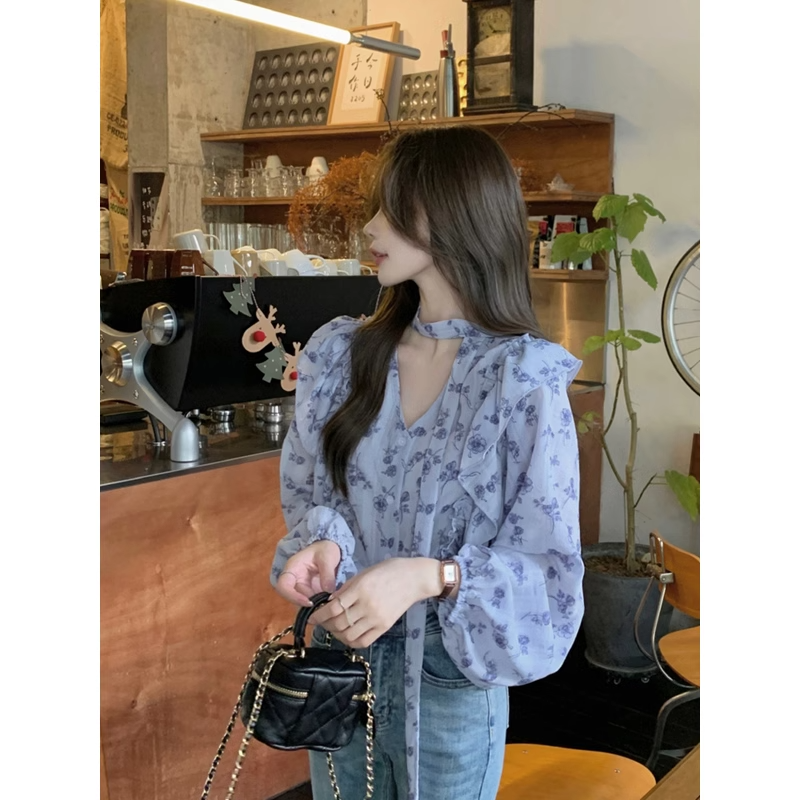 法式甜美v领碎花衬衫女春季设计感荷叶边系带灯笼袖衬衣雪纺上衣