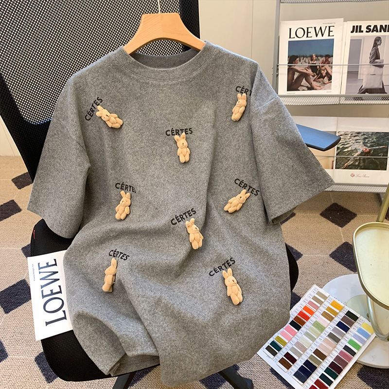 设计感小众重工立体兔子磨毛加厚短袖女2025新款欧货大版t恤上衣