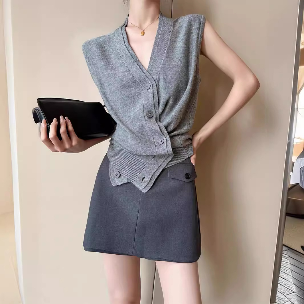 灰色V领无袖针织马甲开衫女夏季新假两件叠穿百搭上衣