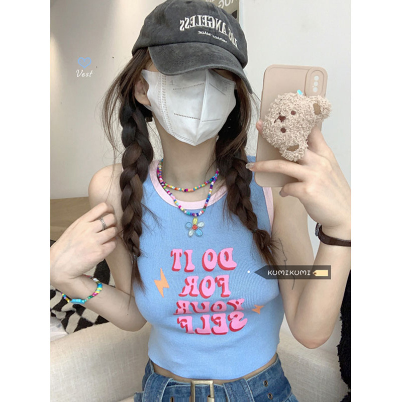 美式复古甜辣妹修身短款露脐背心女夏季小众外穿字母印花打底上衣