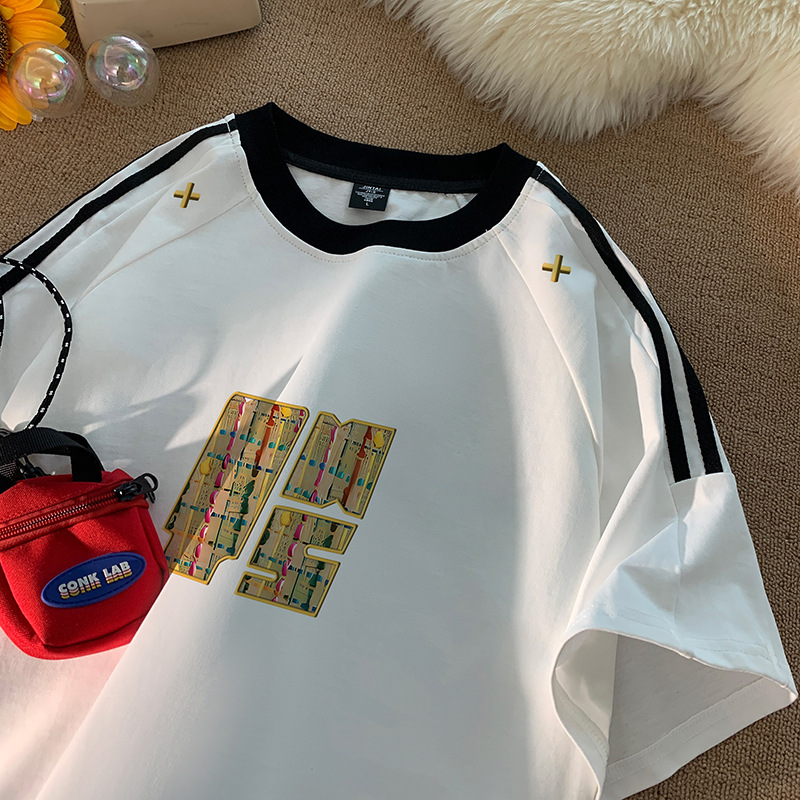 美式复古三条杠正肩短袖t恤男女夏季oversize宽松半袖体恤上衣