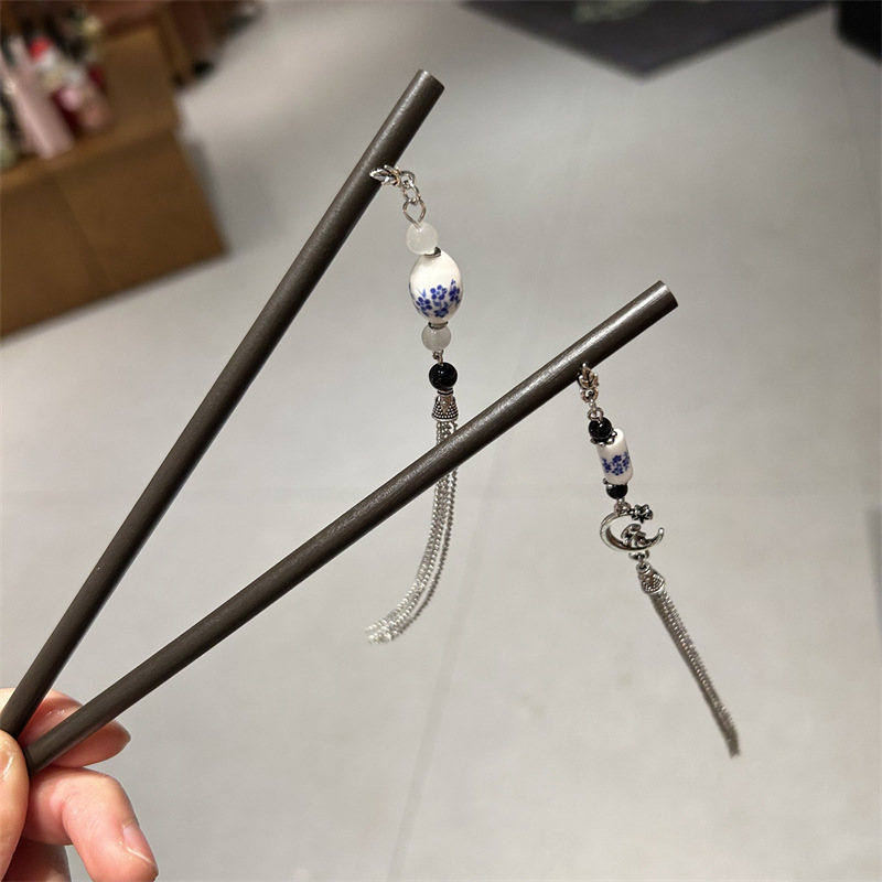 青花瓷古银做旧流苏木簪新中步步摇盘发簪子期盼汉服日常筷子发簪