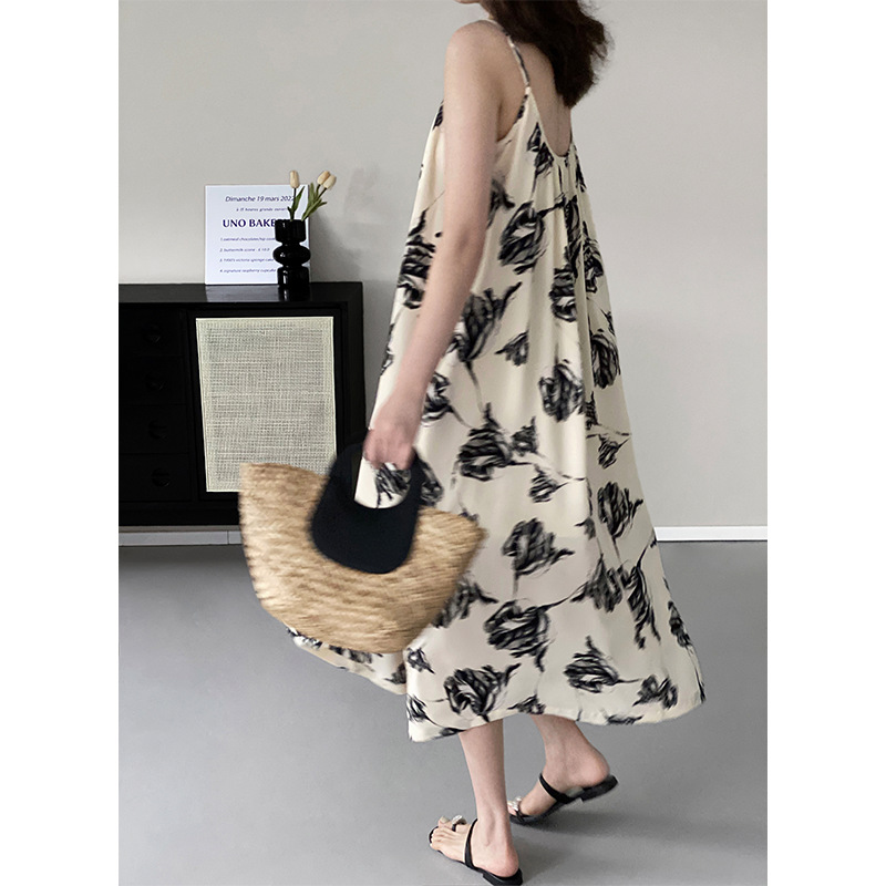 水墨印花吊带连衣裙气质显瘦宽松长裙女