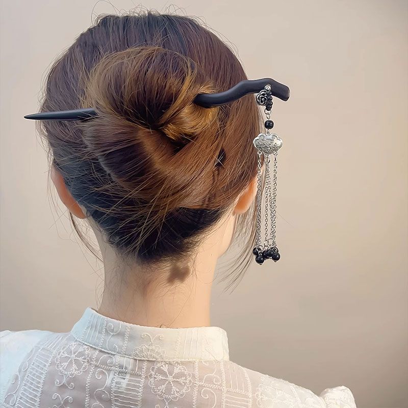 平安富贵锁福木质发簪女中式步摇流苏盘发簪子汉服旗袍古风配饰