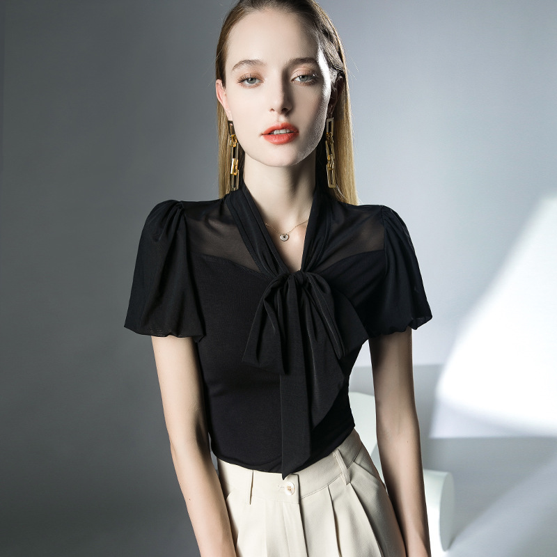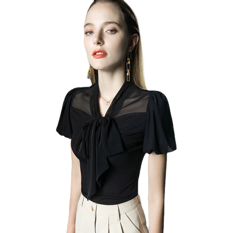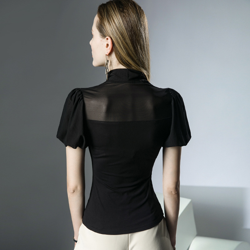 蝴蝶提花半高领网纱T恤女短袖夏季新款韩式包袖女装薄款小衫