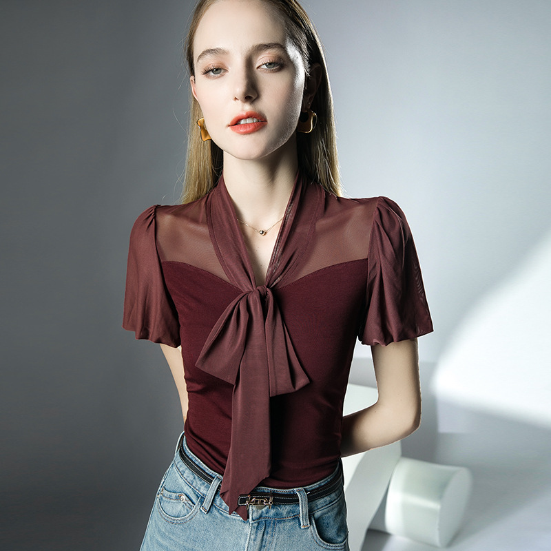 网纱拼接系带上衣夏季新款设计感短袖T恤女