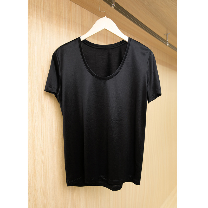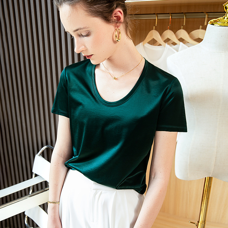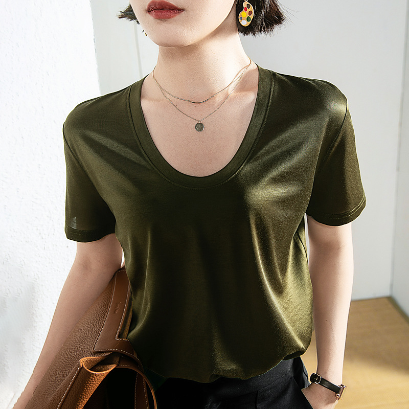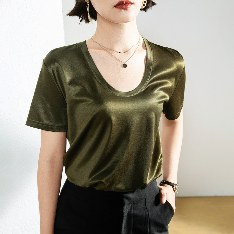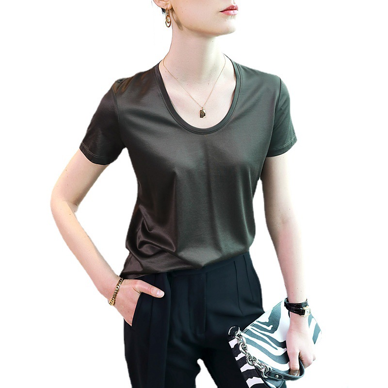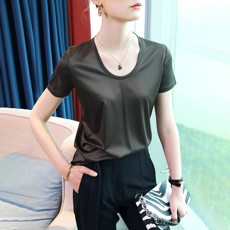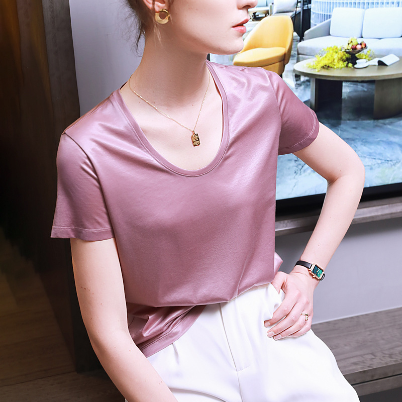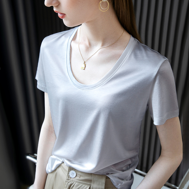 年夏季新款汤勺领短袖丝光棉白色t质感珠光宽松上衣