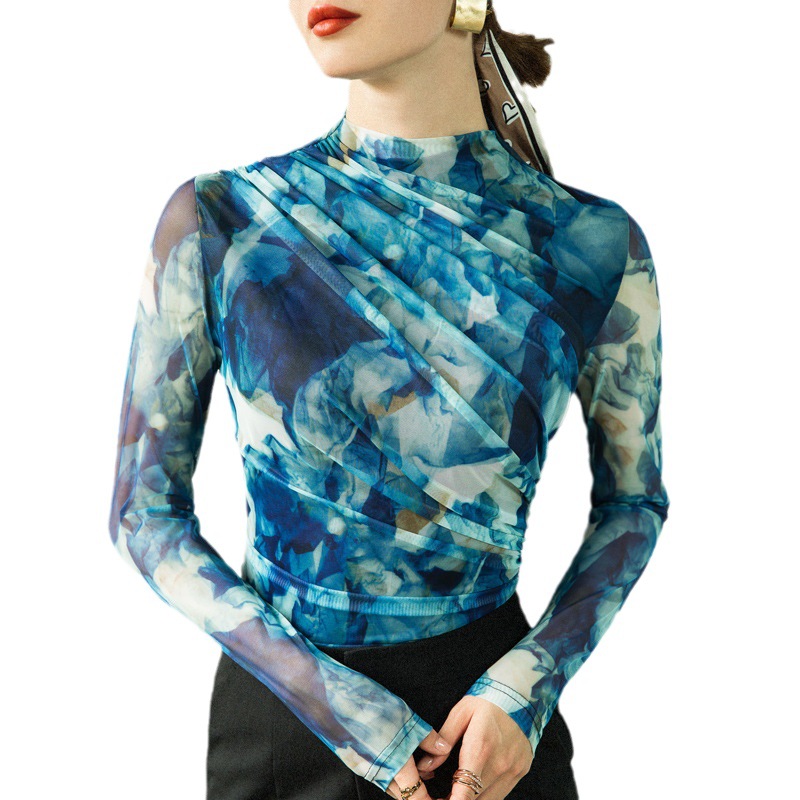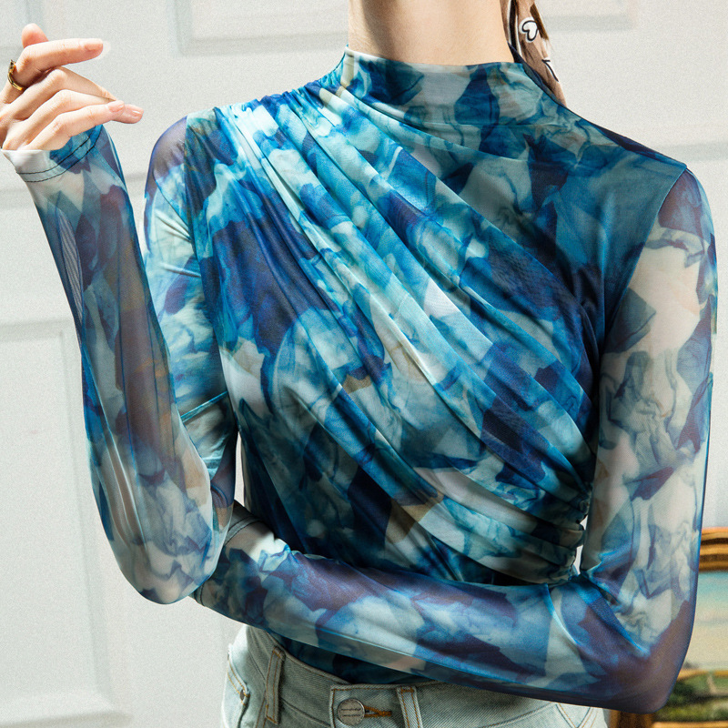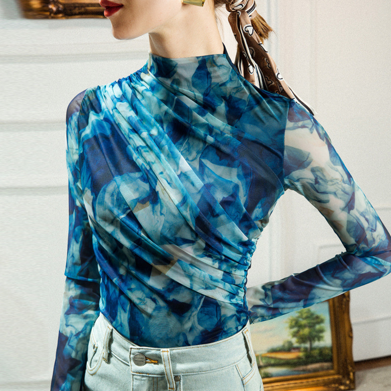 秋冬新款网纱水墨印花抽褶打底衫女内搭洋气欧货小衫