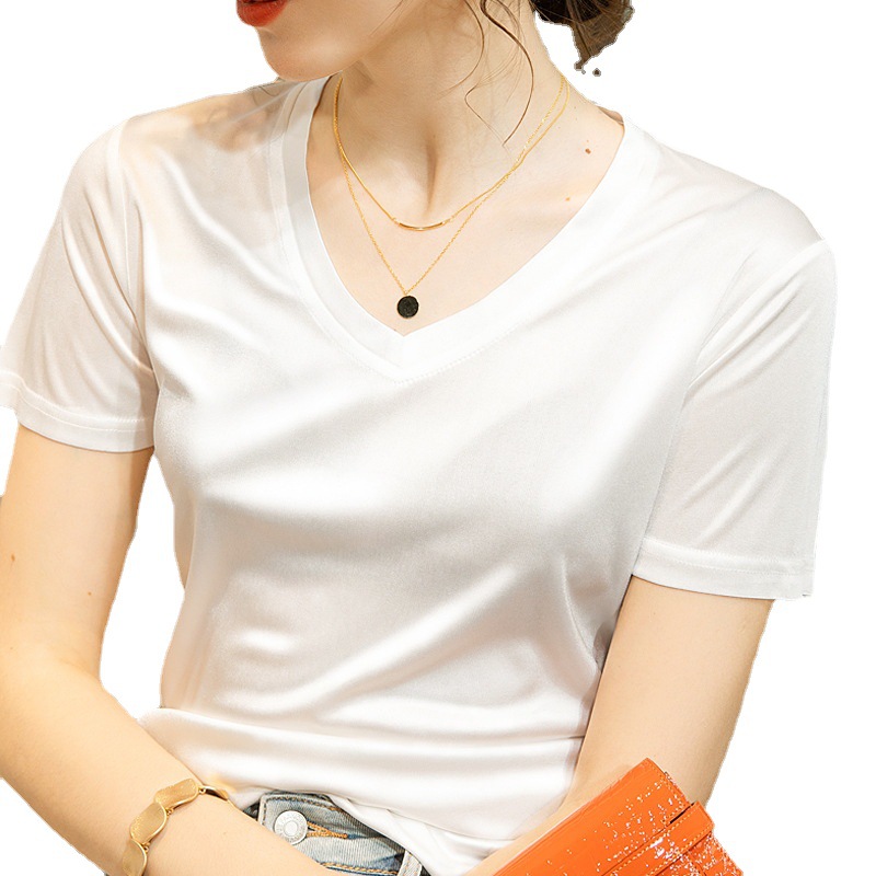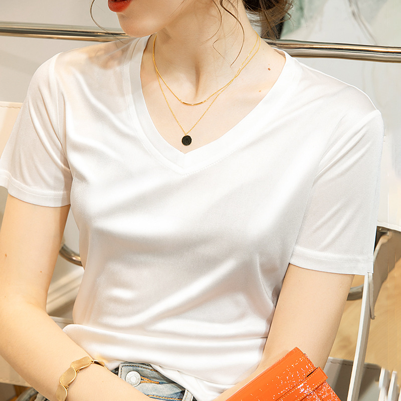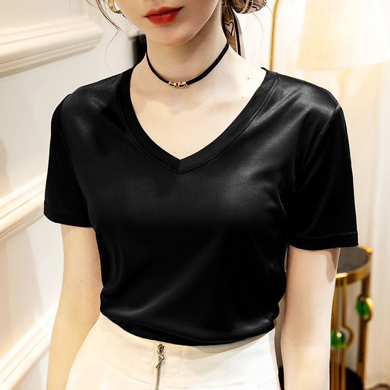 夏季新款醋纤上衣丝滑光泽感短袖T恤V领洋气小衫