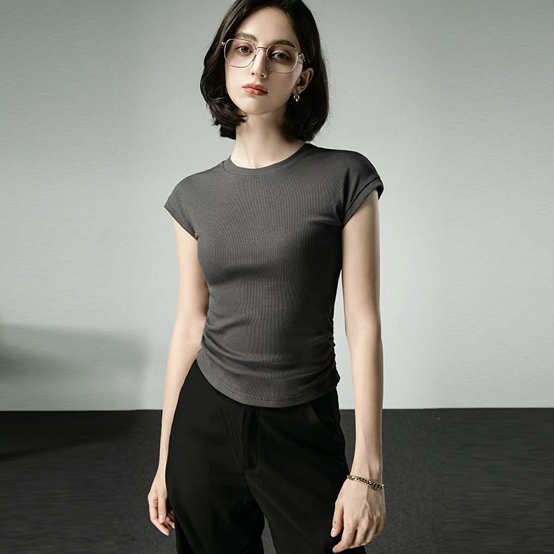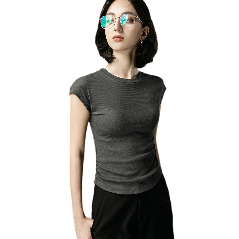 别致设计感短袖女夏季新款弹力螺纹小飞袖T恤卡腰抽褶气质上衣