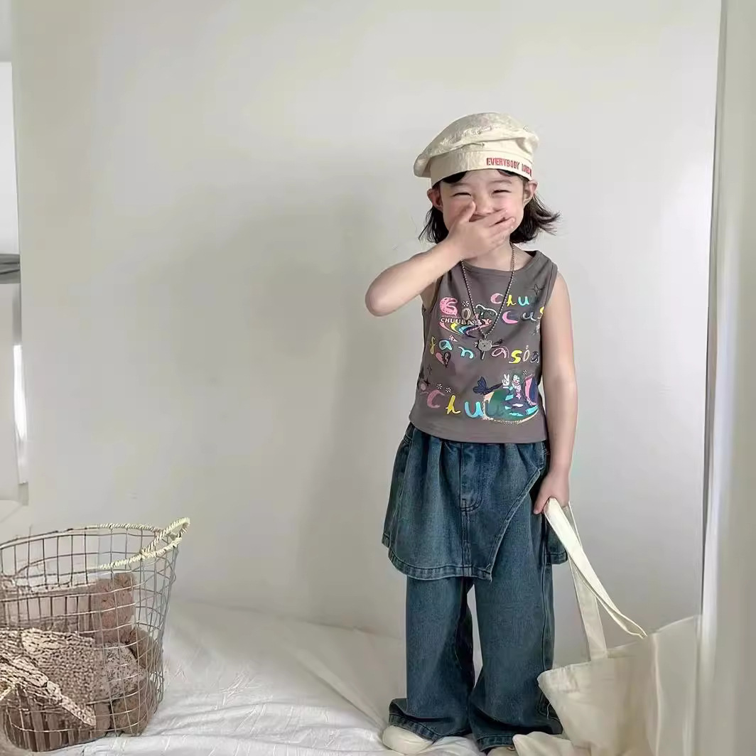 夏季女童套装宝宝洋气儿童个性潮网红韩版卡通背心牛仔裙裤阔腿裤