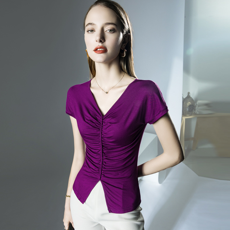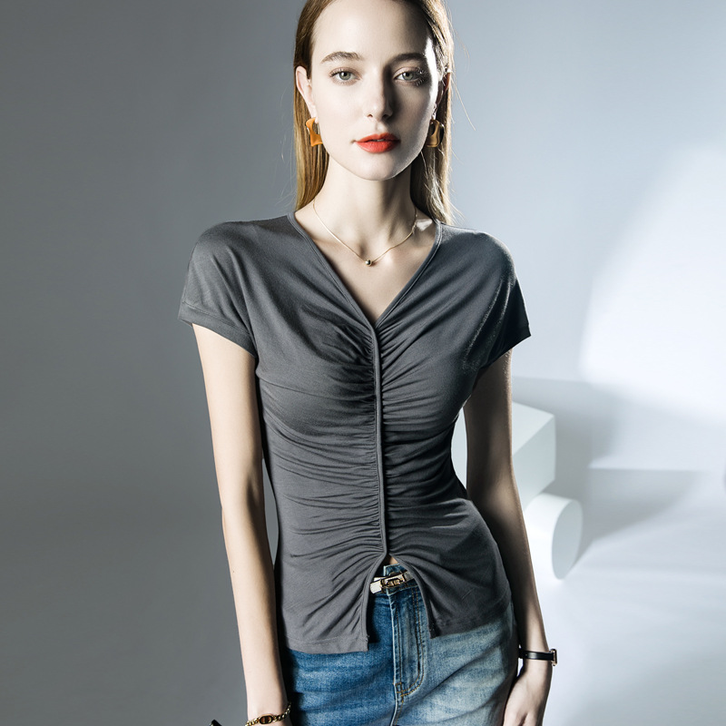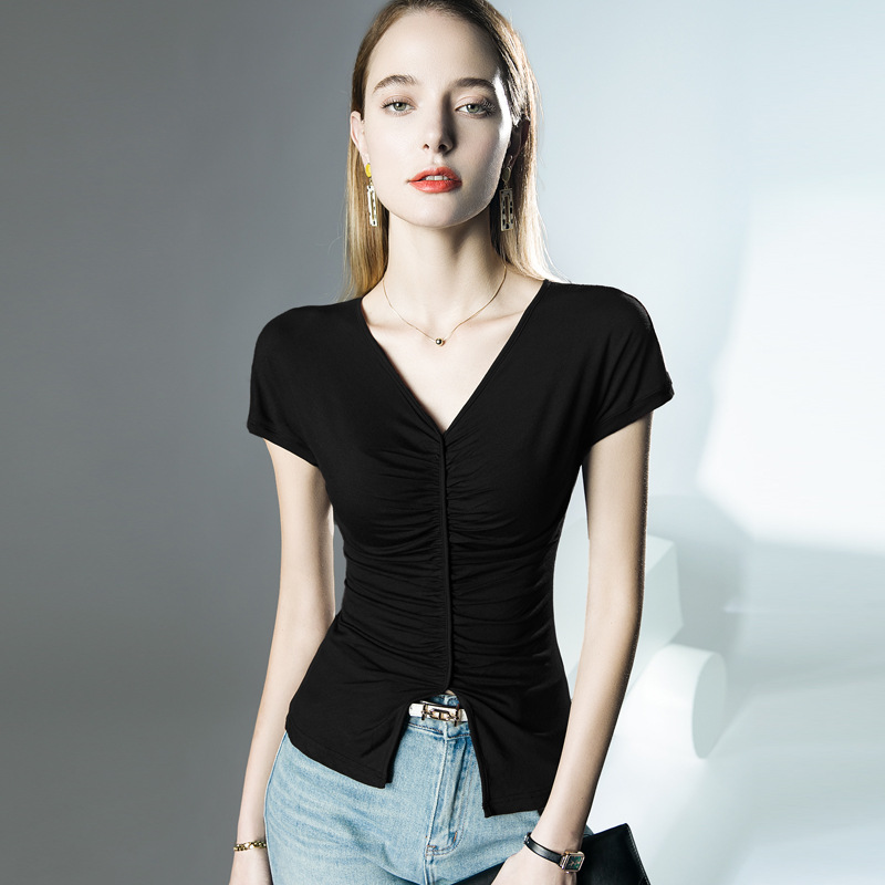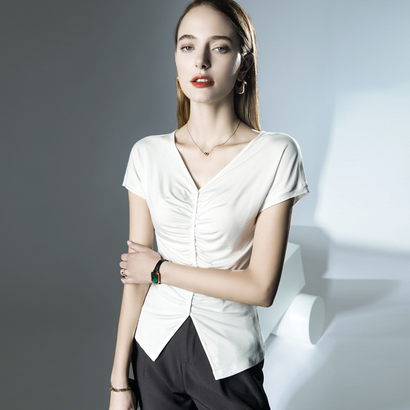 褶皱开叉短袖夏季新款气质盖袖上衣洋气T恤女V领