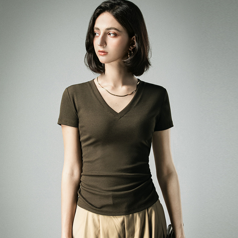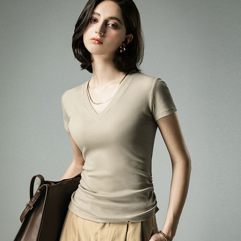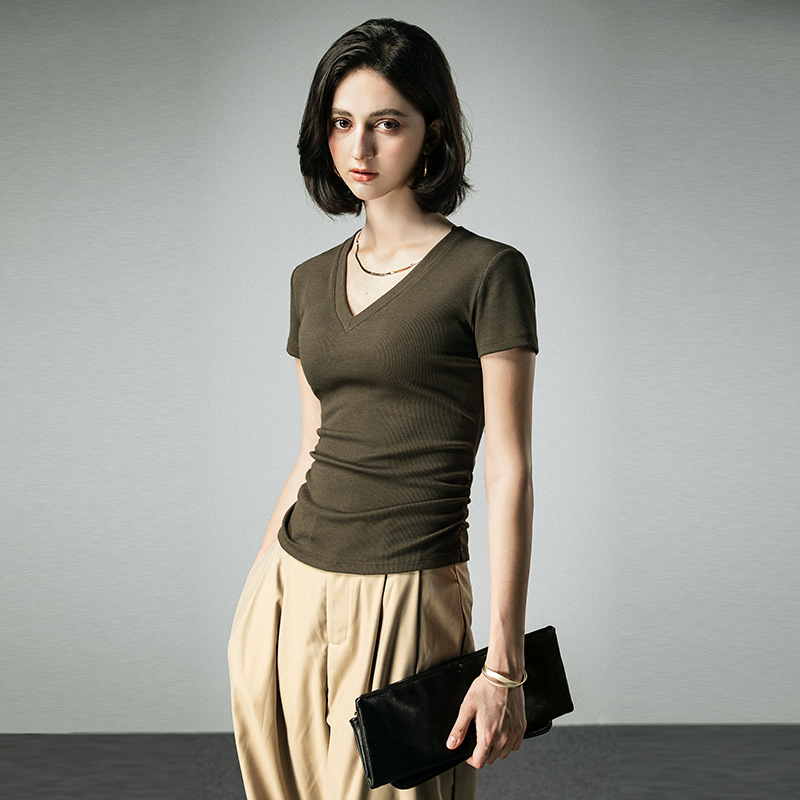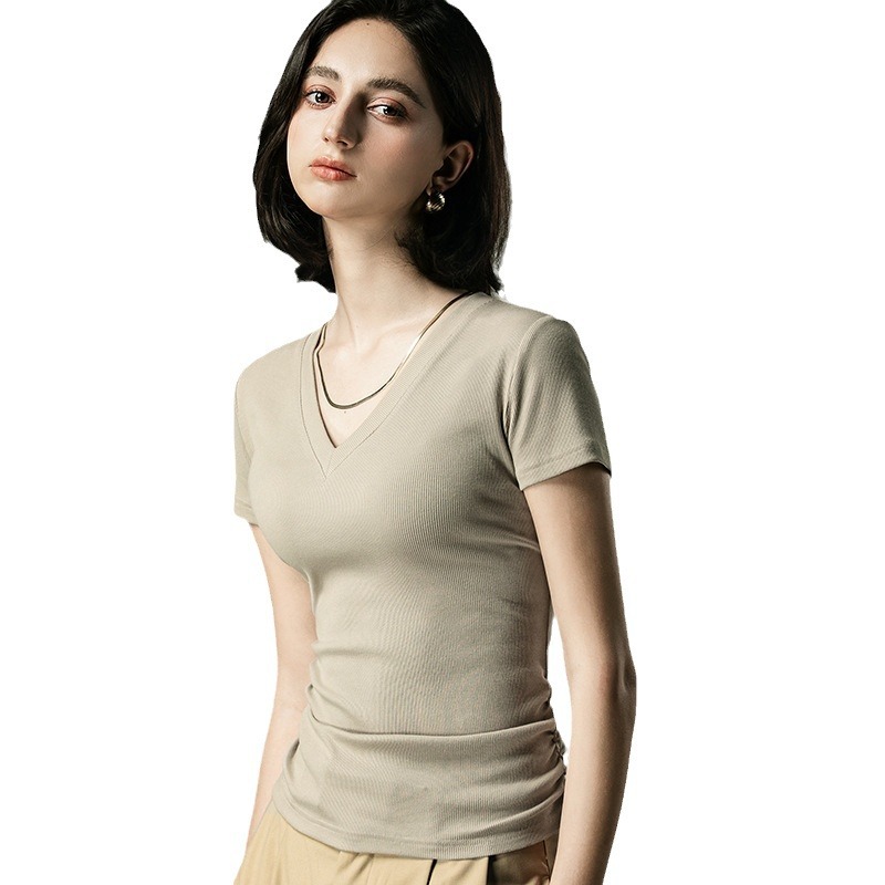 别致V领螺纹弹力短袖夏季新款掐腰修身设计感T恤打底上衣正肩